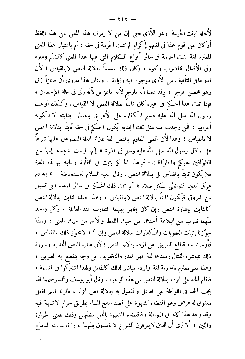 وَقَالَ عَلَيْهِ السَّلَام للمستحاضة إِنَّه دم عرق انفجر فتوضئي لكل صَلَاة ثمَّ ثَبت ذَلِك الحكم فِي سَائِر الدِّمَاء الَّتِي تسيل من الْعُرُوق فَيكون ثَابتا بِدلَالَة النَّص لَا بِالْقِيَاسِ وَلِهَذَا جعلنَا الثَّابِت بِدلَالَة النَّص كَالثَّابِتِ بِإِشَارَة النَّص وَإِن كَانَ يظْهر بَينهمَا التَّفَاوُت عِنْد الْمُقَابلَة وكل وَاحِد مِنْهُمَا ضرب من البلاغة أَحدهمَا من حَيْثُ اللَّفْظ وَالْآخر من حَيْثُ الْمَعْنى وَلِهَذَا جَوَّزنَا إِثْبَات الْعُقُوبَات وَالْكَفَّارَات بِدلَالَة النَّص وَإِن كُنَّا لَا نجوز ذَلِك بِالْقِيَاسِ فأوجبنا حد قطاع الطَّرِيق على الردء بِدلَالَة النَّص لِأَن عبارَة النَّص الْمُحَاربَة وَصُورَة ذَلِك بِمُبَاشَرَة الْقِتَال وَمَعْنَاهَا لُغَة قهر الْعَدو والتخويف على وَجه يَنْقَطِع بِهِ الطَّرِيق وَهَذَا معنى مَعْلُوم بالمحاربة لُغَة والردء مبَاشر لذَلِك كالمقاتل وَلِهَذَا اشْتَركُوا فِي الْغَنِيمَة فيقام الْحَد على الردء بِدلَالَة النَّص من هَذِه الْوُجُوه
