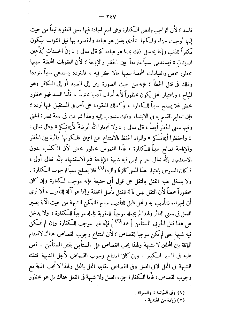 وَلَا يدْخل عَلَيْهِ الْقَتْل بالمثقل على قَول أبي حنيفَة فَإِنَّهُ مُوجب لكفارة وَإِن كَانَ مَحْظُورًا مَحْضا لِأَن المثقل لَيْسَ بِآلَة للْقَتْل بِأَصْل الْخلقَة وَإِنَّمَا هُوَ آلَة للتأديب أَلا ترى أَن إجراءه للتأديب بِهِ وَالْمحل قَابل للتأديب مُبَاح فلتمكن الشُّبْهَة من حَيْثُ الْآلَة يصير الْفِعْل فِي معنى الدائر وَلِهَذَا لم يَجعله مُوجبا للعقوبة فَجعله مُوجبا لِلْكَفَّارَةِ وَلَا يدْخل على هَذَا قتل الْحَرْبِيّ الْمُسْتَأْمن (عمدا) فَإِنَّهُ غير مُوجب لِلْكَفَّارَةِ وَإِن لم تمكن فِيهِ شُبْهَة حَتَّى لم يكن مُوجبا للْقصَاص لِأَن امْتنَاع وجوب الْقصاص هُنَاكَ لِانْعِدَامِ الْمُمَاثلَة بَين المحلين لَا لشُبْهَة وَلِهَذَا يجب الْقصاص على الْمُسْتَأْمن بقتل الْمُسْتَأْمن