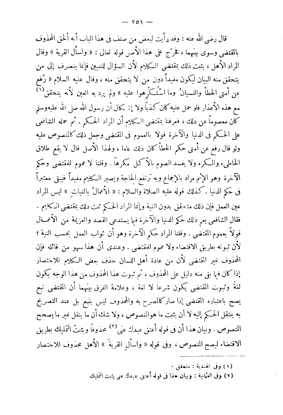 قَالَ رَضِي الله عَنهُ وَقد رَأَيْت لبَعض من صنف فِي هَذَا الْبَاب أَنه ألحق الْمَحْذُوف بالمقتضى وَسوى بَينهمَا فَخرج على هَذَا الأَصْل قَوْله تَعَالَى {واسأل الْقرْيَة} وَقَالَ المُرَاد الْأَهْل يثبت ذَلِك بِمُقْتَضى الْكَلَام لِأَن السُّؤَال للتبيين فَإِنَّمَا ينْصَرف إِلَى من يتَحَقَّق مِنْهُ الْبَيَان ليَكُون مُفِيدا دون من لَا يتَحَقَّق مِنْهُ وَقَالَ عَلَيْهِ السَّلَام رفع عَن أمتِي الْخَطَأ وَالنِّسْيَان وَمَا اسْتكْرهُوا عَلَيْهِ وَلم يرد بِهِ الْعين لِأَنَّهُ يتَحَقَّق مَعَ هَذِه الْأَعْذَار فَلَو حمل عَلَيْهِ كَانَ كذبا وَلَا إِشْكَال أَن رَسُول الله صلى الله عَلَيْهِ وَسلم كَانَ مَعْصُوما عَن ذَلِك فَعرفنَا بِمُقْتَضى الْكَلَام أَن المُرَاد الحكم