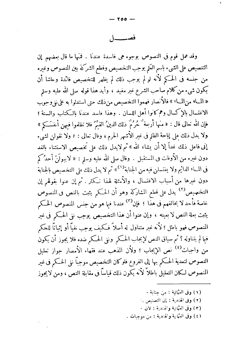 فَمِنْهَا مَا قَالَ بَعضهم إِن التَّنْصِيص على الشَّيْء باسم الْعلم يُوجب التَّخْصِيص وَقطع الشّركَة بَين الْمَنْصُوص وَغَيره من جنسه فِي الحكم لِأَنَّهُ لَو لم يُوجب ذَلِك لم يظْهر للتخصيص فَائِدَة وحاشا أَن يكون شَيْء من كَلَام صَاحب الشَّرْع غير مُفِيد وأيد هَذَا قَوْله صلى الله عَلَيْهِ وَسلم المَاء من المَاء فالأنصار فَهموا التَّخْصِيص من ذَلِك حَتَّى استدلوا بِهِ على نفي وجوب الِاغْتِسَال بالإكسال وهم كَانُوا أهل اللِّسَان