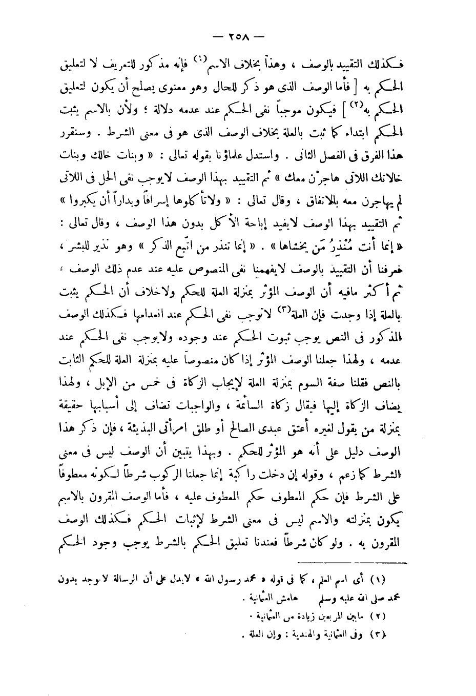 فَكَذَلِك التَّقْيِيد بِالْوَصْفِ وَهَذَا بِخِلَاف الِاسْم فَإِنَّهُ مَذْكُور للتعريف لَا لتعليق الحكم بِهِ (فَأَما الْوَصْف الَّذِي هُوَ ذكر للْحَال وَهُوَ معنوي يصلح أَن يكون لتعليق الحكم بِهِ) فَيكون مُوجبا نفي الحكم عِنْد عَدمه دلَالَة وَلِأَن بِالِاسْمِ يثبت الحكم ابْتِدَاء كَمَا ثَبت بِالْعِلَّةِ بِخِلَاف الْوَصْف الَّذِي هُوَ فِي معنى الشَّرْط