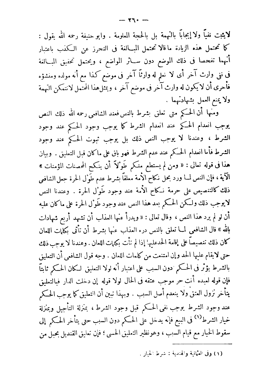 وَمِنْهَا أَن الحكم مَتى تعلق بِشَرْط بِالنَّصِّ فَعِنْدَ الشَّافِعِي رَحمَه الله ذَلِك النَّص يُوجب انعدام الحكم عِنْد انعدام الشَّرْط كَمَا يُوجب وجود الحكم عِنْد وجود الشَّرْط وَعِنْدنَا لَا يُوجب النَّص ذَلِك بل يُوجب ثُبُوت الحكم عِنْد وجود الشَّرْط فَأَما انعدام الحكم عِنْد عدم الشَّرْط فَهُوَ بَاقٍ على مَا كَانَ قبل التَّعْلِيق