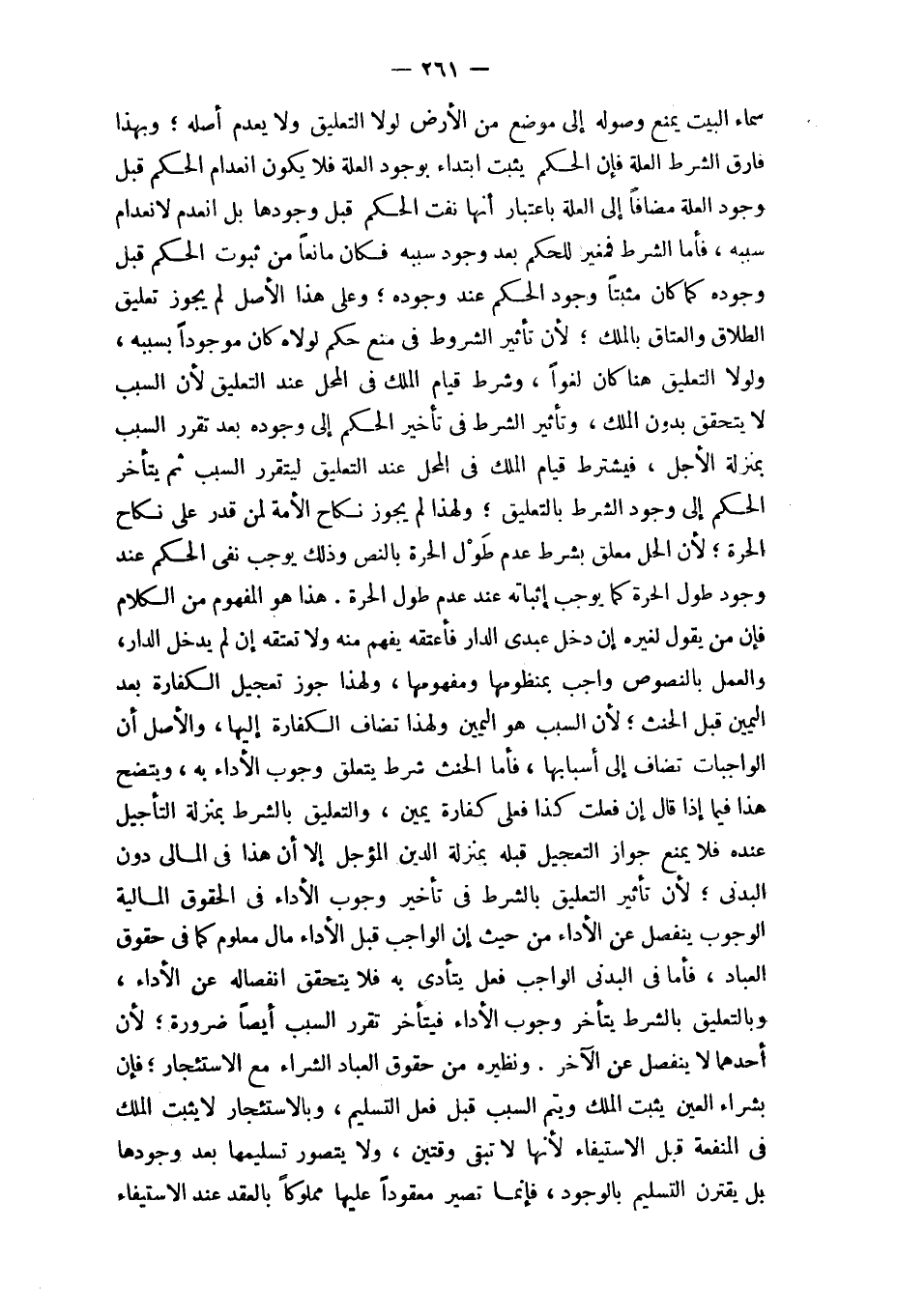 سَمَاء الْبَيْت يمْنَع وُصُوله إِلَى مَوضِع من الأَرْض لَوْلَا التَّعْلِيق وَلَا يعْدم أَصله وَبِهَذَا فَارق الشَّرْط الْعلَّة فَإِن الحكم يثبت ابْتِدَاء بِوُجُود الْعلَّة فَلَا يكون انعدام الحكم قبل وجود الْعلَّة مُضَافا إِلَى الْعلَّة بِاعْتِبَار أَنَّهَا نفت الحكم قبل وجودهَا بل انْعَدم لِانْعِدَامِ سَببه فَأَما الشَّرْط فمغير للْحكم بعد وجود سَببه فَكَانَ مَانِعا من ثُبُوت الحكم قبل وجوده كَمَا كَانَ مثبتا وجود الحكم عِنْد وجوده وعَلى هَذَا الأَصْل لم يجوز تَعْلِيق الطَّلَاق وَالْعتاق بِالْملكِ لِأَن تَأْثِير الشُّرُوط فِي منع حكم لولاه كَانَ مَوْجُودا بِسَبَبِهِ وَلَوْلَا التَّعْلِيق هُنَا كَانَ لَغوا وَشرط قيام الْملك فِي الْمحل عِنْد التَّعْلِيق لِأَن السَّبَب لَا يتَحَقَّق بِدُونِ الْملك وتأثير الشَّرْط فِي تَأْخِير الحكم إِلَى وجوده بعد تقرر السَّبَب بِمَنْزِلَة الْأَجَل فَيشْتَرط قيام الْملك فِي الْمحل عِنْد التَّعْلِيق ليتقرر السَّبَب ثمَّ يتَأَخَّر الحكم إِلَى وجود الشَّرْط بِالتَّعْلِيقِ وَلِهَذَا لم يجوز نِكَاح الْأمة لمن قدر على نِكَاح الْحرَّة لِأَن الْحل مُعَلّق بِشَرْط عدم طول الْحرَّة بِالنَّصِّ وَذَلِكَ يُوجب نفي الحكم عِنْد وجود طول الْحرَّة كَمَا يُوجب إثْبَاته عِنْد عدم طول الْحرَّة