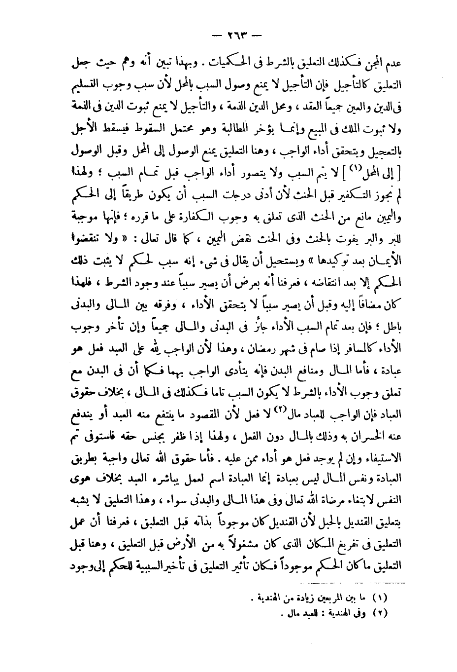 فَأَما حُقُوق الله تَعَالَى وَاجِبَة بطرِيق الْعِبَادَة وَنَفس المَال لَيْسَ بِعبَادة إِنَّمَا الْعِبَادَة اسْم لعمل يباشره العَبْد بِخِلَاف هوى النَّفس لابتغاء مرضاة الله تَعَالَى وَفِي هَذَا المالي والبدني سَوَاء وَهَذَا التَّعْلِيق لَا يشبه بتعليق الْقنْدِيل بالحبل لِأَن الْقنْدِيل كَانَ مَوْجُودا بِذَاتِهِ قبل التَّعْلِيق فَعرفنَا أَن عمل التَّعْلِيق فِي تَفْرِيغ الْمَكَان الَّذِي كَانَ مَشْغُولًا بِهِ من الأَرْض قبل التَّعْلِيق وَهنا قبل التَّعْلِيق مَا كَانَ الحكم مَوْجُودا فَكَانَ تَأْثِير التَّعْلِيق فِي تَأْخِير السَّبَبِيَّة للْحكم إِلَى وجود
