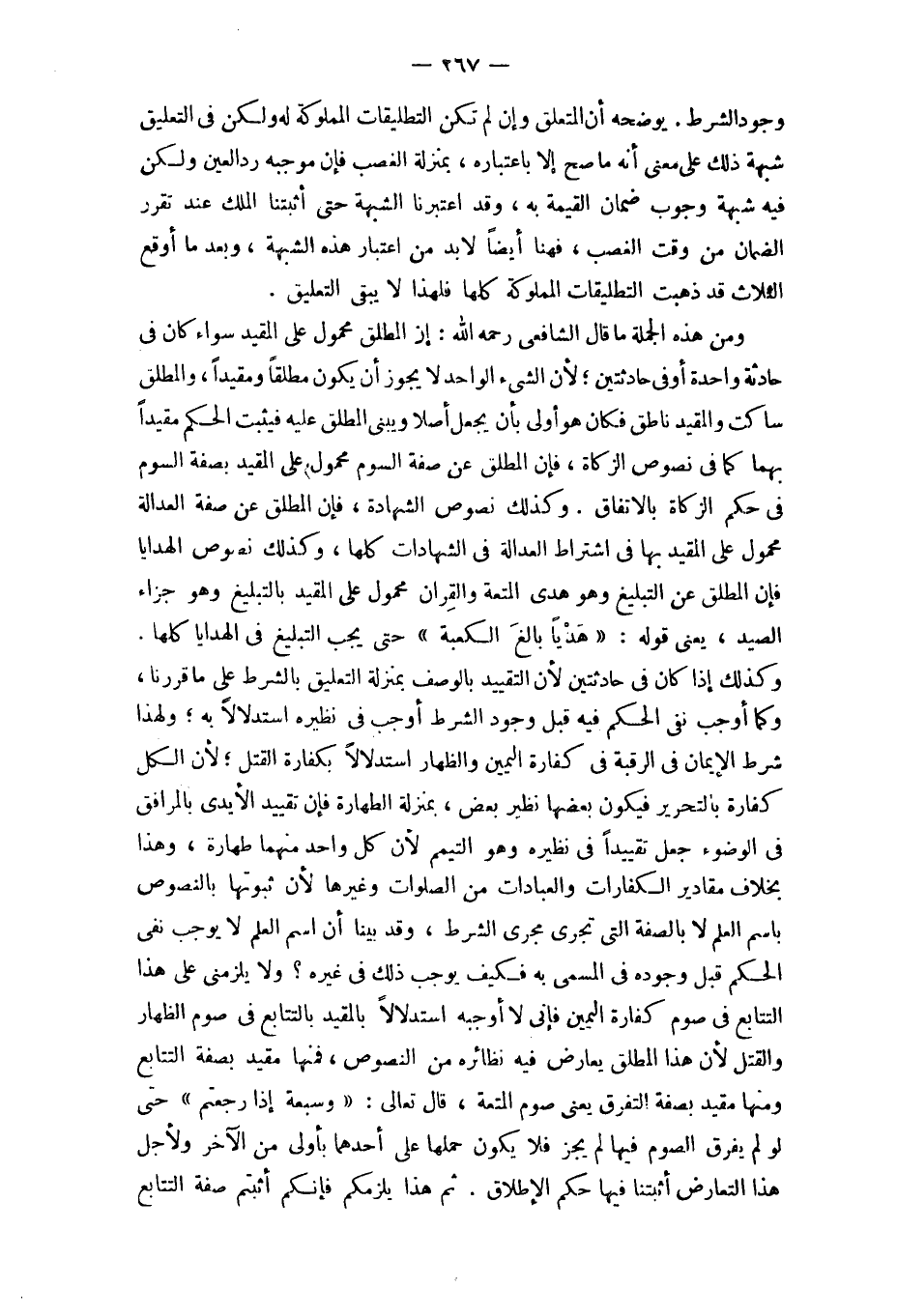 وَمن هَذِه الْجُمْلَة مَا قَالَ الشَّافِعِي رَحمَه الله إِن الْمُطلق مَحْمُول على الْمُقَيد سَوَاء كَانَ فِي حَادِثَة وَاحِدَة أَو فِي حادثتين لِأَن الشَّيْء الْوَاحِد لَا يجوز أَن يكون مُطلقًا ومقيدا وَالْمُطلق سَاكِت والمقيد نَاطِق فَكَانَ هُوَ أولى بِأَن يَجْعَل أصلا وَيَبْنِي الْمُطلق عَلَيْهِ فَيثبت الحكم مُقَيّدا بهما كَمَا فِي نُصُوص الزَّكَاة فَإِن الْمُطلق عَن صفة السّوم مَحْمُول على الْمُقَيد بِصفة السّوم فِي حكم الزَّكَاة بالِاتِّفَاقِ