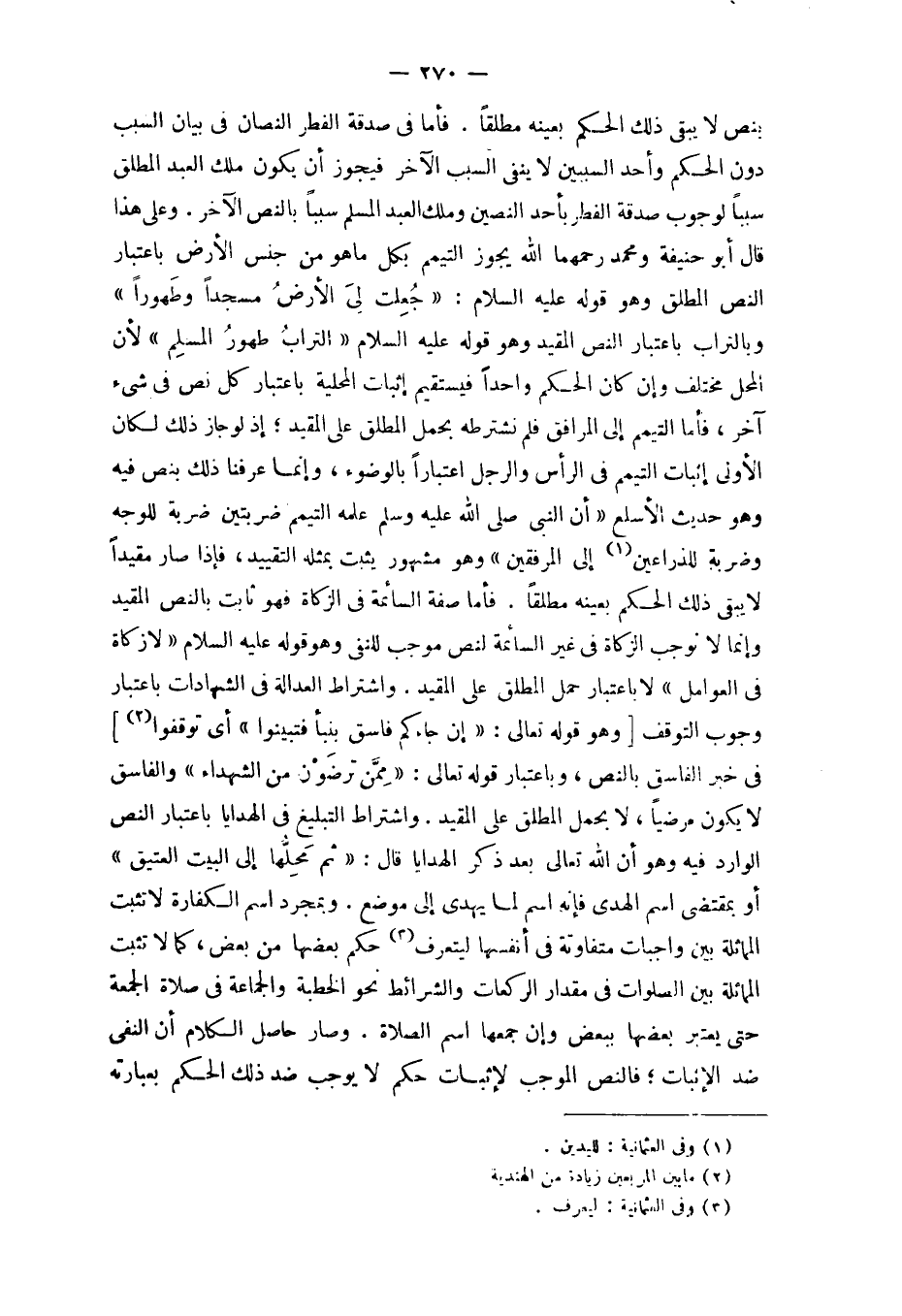 فَأَما فِي صَدَقَة الْفطر النصان فِي بَيَان السَّبَب دون الحكم وَأحد السببين لَا يَنْفِي السَّبَب الآخر فَيجوز أَن يكون ملك العَبْد الْمُطلق سَببا لوُجُوب صَدَقَة الْفطر بِأحد النصين وَملك العَبْد الْمُسلم سَببا بِالنَّصِّ الآخر