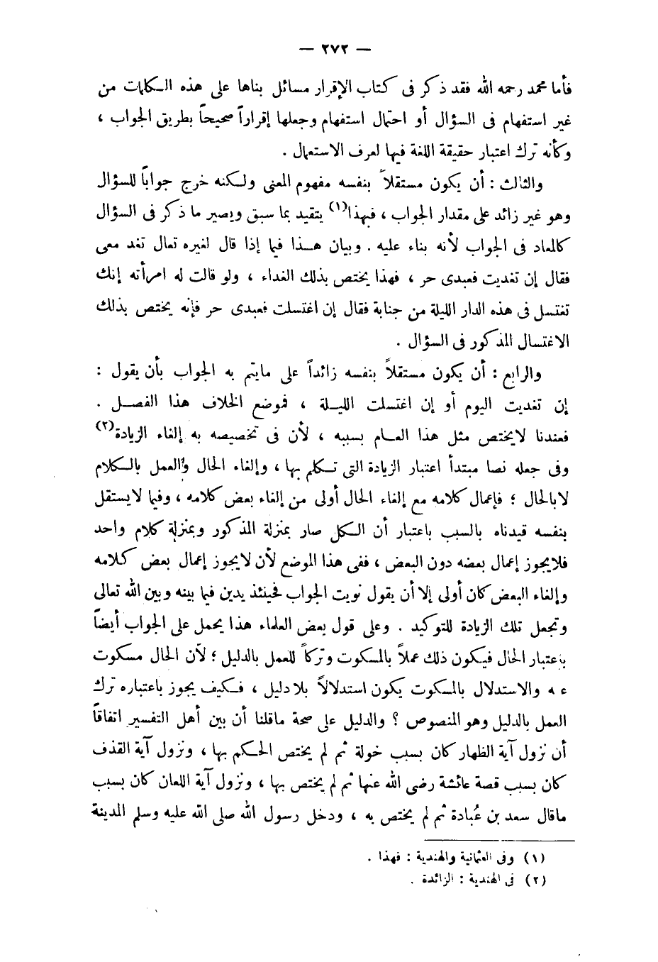 فعندنا لَا يخْتَص مثل هَذَا الْعَام بِسَبَبِهِ لِأَن فِي تَخْصِيصه بِهِ إِلْغَاء الزِّيَادَة وَفِي جعله نصا مُبْتَدأ اعْتِبَار الزِّيَادَة الَّتِي تكلم بهَا وإلغاء الْحَال وَالْعَمَل بالْكلَام لَا بِالْحَال فإعمال كَلَامه مَعَ إِلْغَاء الْحَال أولى من إِلْغَاء بعض كَلَامه وَفِيمَا لَا يسْتَقلّ بِنَفسِهِ قيدناه بِالسَّبَبِ بِاعْتِبَار أَن الْكل صَار بِمَنْزِلَة الْمَذْكُور وبمنزلة كَلَام وَاحِد فَلَا يجوز إِعْمَال بعضه دون الْبَعْض فَفِي هَذَا الْموضع لِأَن لَا يجوز إِعْمَال بعض كَلَامه وإلغاء الْبَعْض كَانَ أولى إِلَّا أَن يَقُول نَوَيْت الْجَواب فَحِينَئِذٍ يدين فِيمَا بَينه وَبَين الله تَعَالَى وَتجْعَل تِلْكَ الزِّيَادَة للتوكيد