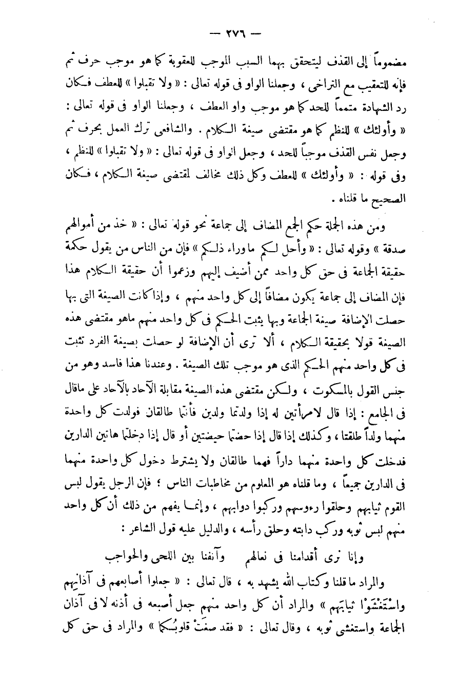 وَمن هَذِه الْجُمْلَة حكم الْجمع الْمُضَاف إِلَى جمَاعَة نَحْو قَوْله تَعَالَى {خُذ من أَمْوَالهم صَدَقَة} وَقَوله تَعَالَى {وَأحل لكم مَا وَرَاء ذَلِكُم} فَإِن من النَّاس من يَقُول حِكْمَة حَقِيقَة الْجَمَاعَة فِي حق كل وَاحِد مِمَّن أضيف إِلَيْهِم وَزَعَمُوا أَن حَقِيقَة الْكَلَام هَذَا فَإِن الْمُضَاف إِلَى جمَاعَة يكون مُضَافا إِلَى كل وَاحِد مِنْهُم وَإِذا كَانَت الصِّيغَة الَّتِي بهَا حصلت الْإِضَافَة صِيغَة الْجَمَاعَة وَبهَا يثبت الحكم فِي كل وَاحِد مِنْهُم مَا هُوَ مُقْتَضى هَذِه الصِّيغَة قولا بِحَقِيقَة الْكَلَام أَلا ترى أَن الْإِضَافَة لَو حصلت بِصِيغَة الْفَرد تثبت فِي كل وَاحِد مِنْهُم الحكم الَّذِي هُوَ مُوجب تِلْكَ الصِّيغَة