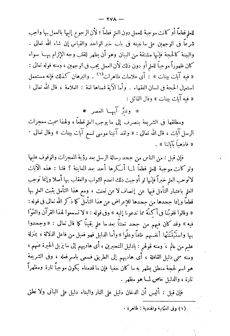 فَإِن قيل من النَّاس من جحد رِسَالَة الرُّسُل بعد رُؤْيَة المعجزات وَالْوُقُوف عَلَيْهَا وَلَو كَانَت مُوجبَة للْعلم قطعا لما أنكرها أحد بعد المعاينة قُلْنَا هَذِه الْآيَات لَا توجب الْعلم خَبرا فَإِنَّهَا لَو أوجبت ذَلِك انْعَدم الثَّوَاب وَالْعِقَاب بهَا أصلا وَإِنَّمَا توجب الْعلم بِاعْتِبَار التَّأَمُّل فِيهَا عَن إنصاف لَا عَن تعنت وَمَعَ هَذَا التَّأَمُّل يثبت الْعلم بهَا قطعا وَإِنَّمَا جَحدهَا من جَحدهَا للإعراض عَن هَذَا التَّأَمُّل كَمَا ذكر الله تَعَالَى فِي قَوْله {وَقَالُوا قُلُوبنَا فِي أكنة مِمَّا تدعونا إِلَيْهِ} وَفِي قَوْله {لَا تسمعوا لهَذَا الْقُرْآن والغوا فِيهِ} وَقد كَانَ فيهم من جحد تعنتا بَعْدَمَا علم يَقِينا كَمَا قَالَ تَعَالَى {وجحدوا بهَا واستيقنتها أنفسهم ظلما وعلوا} وَأما الدَّلِيل فَهُوَ فعيل من فَاعل الدّلَالَة بِمَنْزِلَة عليم من عَالم وَمِنْه قَوْلهم يَا دَلِيل المتحيرين أَي هاديهم إِلَى مَا يزِيل الْحيرَة عَنْهُم وَمِنْه سمي دَلِيل الْقَافِلَة أَي هاديهم إِلَى الطَّرِيق فَسُمي باسم فعله وَفِي الشَّرِيعَة هُوَ اسْم لحجة منطق يظْهر بِهِ مَا كَانَ خفِيا فَإِن مَا قدمْنَاهُ يكون مُوجبا تَارَة ومظهرا تَارَة وَالدَّلِيل خَاص لما هُوَ مظهر