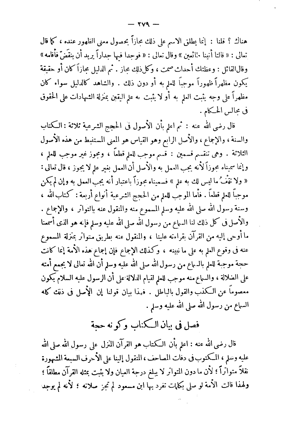 فصل فِي بَيَان الْكتاب وَكَونه حجَّة