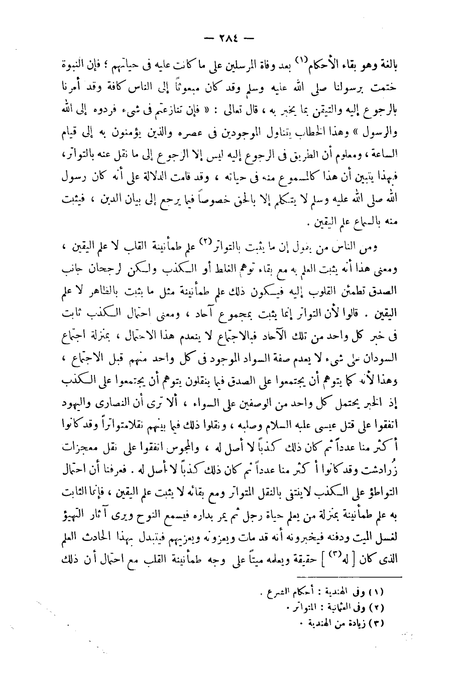 بَالِغَة وَهُوَ بَقَاء الْأَحْكَام بعد وَفَاة الْمُرْسلين على مَا كَانَت عَلَيْهِ فِي حياتهم فَإِن النُّبُوَّة ختمت برسولنا صلى الله عَلَيْهِ وَسلم وَقد كَانَ مَبْعُوثًا إِلَى النَّاس كَافَّة وَقد أمرنَا بِالرُّجُوعِ إِلَيْهِ والتيقن بِمَا يخبر بِهِ قَالَ تَعَالَى {فَإِن تنازعتم فِي شَيْء فَردُّوهُ إِلَى الله وَالرَّسُول} وَهَذَا الْخطاب يتَنَاوَل الْمَوْجُودين فِي عصره وَالَّذين يُؤمنُونَ بِهِ إِلَى قيام السَّاعَة وَمَعْلُوم أَن الطَّرِيق فِي الرُّجُوع إِلَيْهِ لَيْسَ إِلَّا الرُّجُوع إِلَى مَا نقل عَنهُ بالتواتر فَبِهَذَا يتَبَيَّن أَن هَذَا كالمسموع مِنْهُ فِي حَيَاته وَقد قَامَت الدّلَالَة على أَنه كَانَ رَسُول الله صلى الله عَلَيْهِ وَسلم لَا يتَكَلَّم إِلَّا بِالْحَقِّ خُصُوصا فِيمَا يرجع إِلَى بَيَان الدّين فَيثبت مِنْهُ بِالسَّمَاعِ علم الْيَقِين