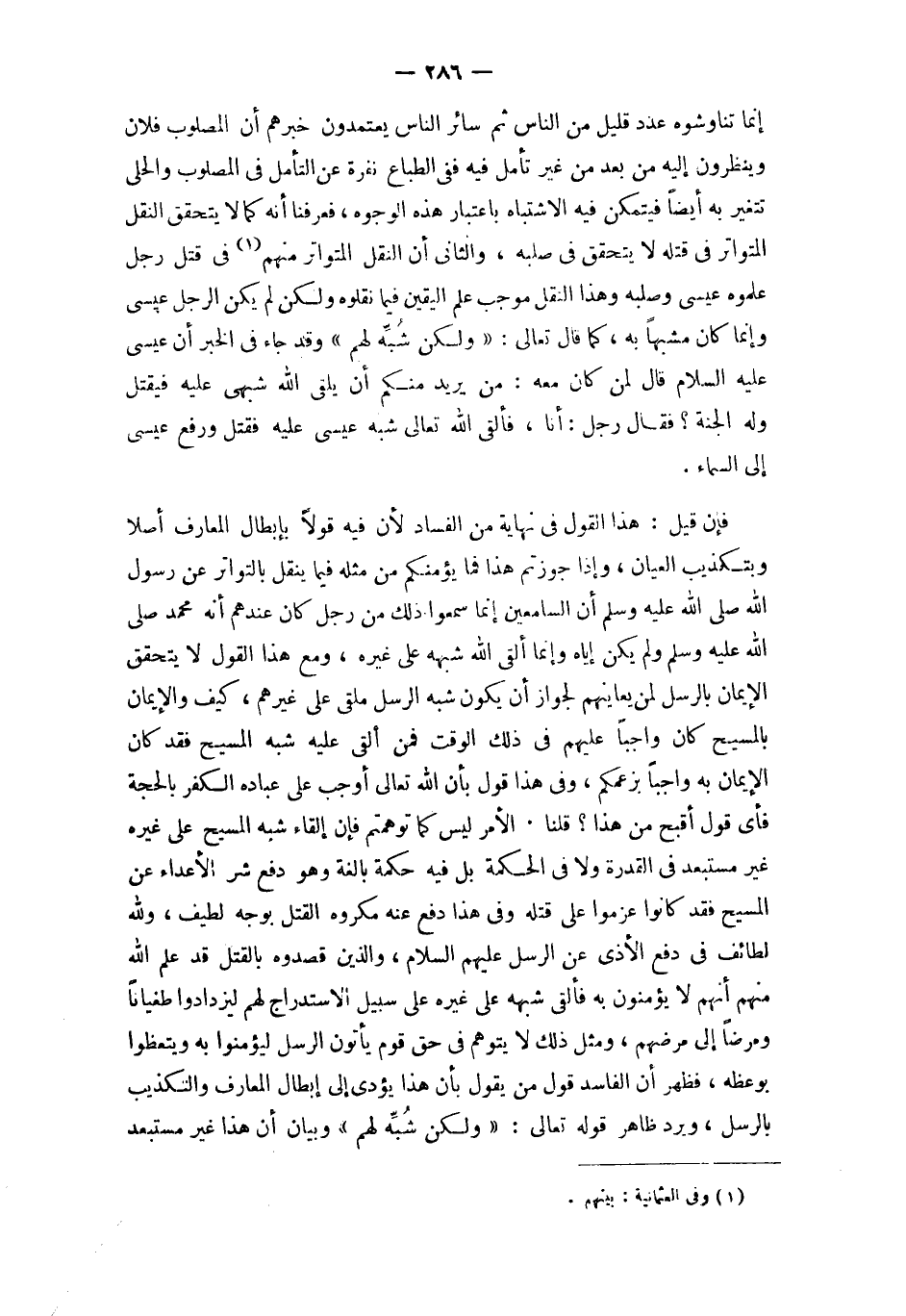 إِنَّمَا تناوشوه عدد قَلِيل من النَّاس ثمَّ سَائِر النَّاس يعتمدون خبرهم أَن المصلوب فلَان وَيَنْظُرُونَ إِلَيْهِ من بعد من غير تَأمل فِيهِ فَفِي الطباع نفرة عَن التَّأَمُّل فِي المصلوب والحلي تَتَغَيَّر بِهِ أَيْضا فيتمكن فِيهِ الِاشْتِبَاه بِاعْتِبَار هَذِه الْوُجُوه فَعرفنَا أَنه كَمَا لَا يتَحَقَّق النَّقْل الْمُتَوَاتر فِي قَتله لَا يتَحَقَّق فِي صلبه وَالثَّانِي أَن النَّقْل الْمُتَوَاتر مِنْهُم فِي قتل رجل علموه عِيسَى وصلبه وَهَذَا النَّقْل مُوجب علم الْيَقِين فِيمَا نقلوه وَلَكِن لم يكن الرجل عِيسَى وَإِنَّمَا كَانَ مشبها بِهِ كَمَا قَالَ تَعَالَى {وَلَكِن شبه لَهُم} وَقد جَاءَ فِي الْخَبَر أَن عِيسَى عَلَيْهِ السَّلَام قَالَ لمن كَانَ مَعَه من يُرِيد مِنْكُم أَن يلقِي الله شبهي عَلَيْهِ فَيقْتل وَله الْجنَّة فَقَالَ رجل أَنا فَألْقى الله تَعَالَى شبه عِيسَى عَلَيْهِ فَقتل وَرفع عِيسَى إِلَى السَّمَاء