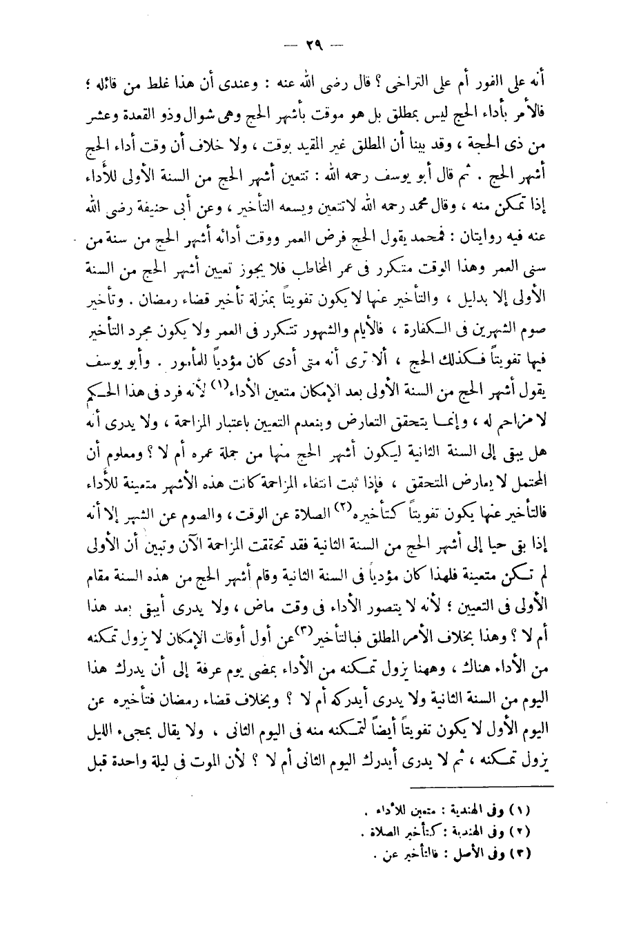 ثمَّ قَالَ أَبُو يُوسُف رَحمَه الله تتَعَيَّن أشهر الْحَج من السّنة الأولى للْأَدَاء إِذا تمكن مِنْهُ وَقَالَ مُحَمَّد رَحمَه الله لَا تتَعَيَّن ويسعه التَّأْخِير وَعَن أبي حنيفَة رَضِي الله عَنهُ فِيهِ رِوَايَتَانِ ف مُحَمَّد يَقُول الْحَج فرض الْعُمر وَوقت أَدَائِهِ أشهر الْحَج من سنة من سني الْعُمر وَهَذَا الْوَقْت متكرر فِي عمر الْمُخَاطب فَلَا يجوز تعْيين أشهر الْحَج من السّنة الأولى إِلَّا بِدَلِيل وَالتَّأْخِير عَنْهَا لَا يكون تفويتا بِمَنْزِلَة تَأْخِير قَضَاء رَمَضَان