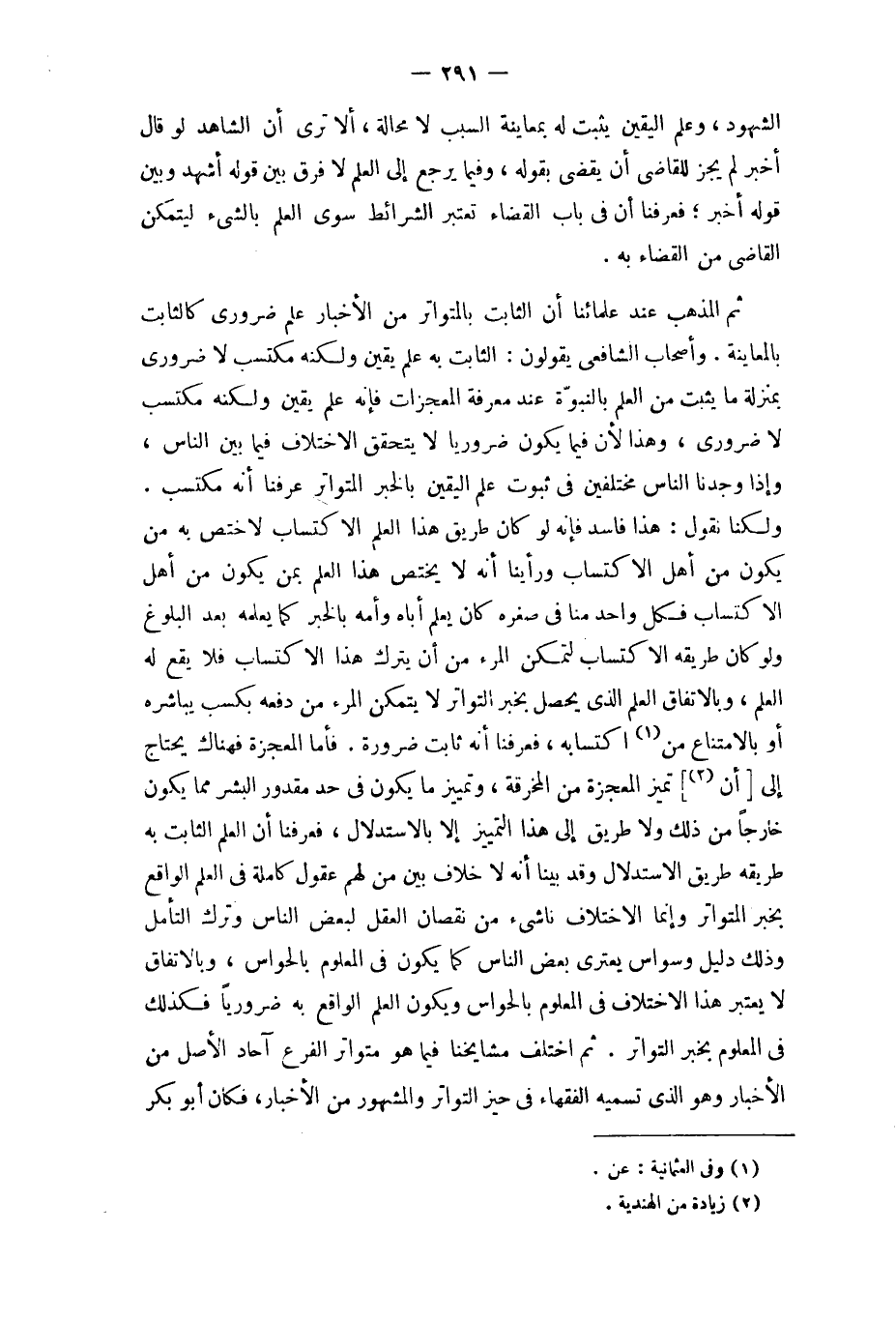 فَأَما المعجزة فهناك يحْتَاج إِلَى (أَن) تميز المعجزة من المخرقة وتمييز مَا يكون فِي حد مَقْدُور الْبشر مِمَّا يكون خَارِجا من ذَلِك وَلَا طَرِيق إِلَى هَذَا التَّمْيِيز إِلَّا بالاستدلال فَعرفنَا أَن الْعلم الثَّابِت بِهِ طَرِيقه طَرِيق الِاسْتِدْلَال وَقد بَينا أَنه لَا خلاف بَين من لَهُم عقول كَامِلَة فِي الْعلم الْوَاقِع بِخَبَر الْمُتَوَاتر وَإِنَّمَا الِاخْتِلَاف ناشىء من نُقْصَان الْعقل لبَعض النَّاس وَترك التَّأَمُّل وَذَلِكَ دَلِيل وسواس يعتري بعض النَّاس كَمَا يكون فِي الْمَعْلُوم بالحواس وبالاتفاق لَا يعْتَبر هَذَا الِاخْتِلَاف فِي الْمَعْلُوم بالحواس وَيكون الْعلم الْوَاقِع بِهِ ضَرُورِيًّا فَكَذَلِك فِي الْمَعْلُوم بِخَبَر التَّوَاتُر