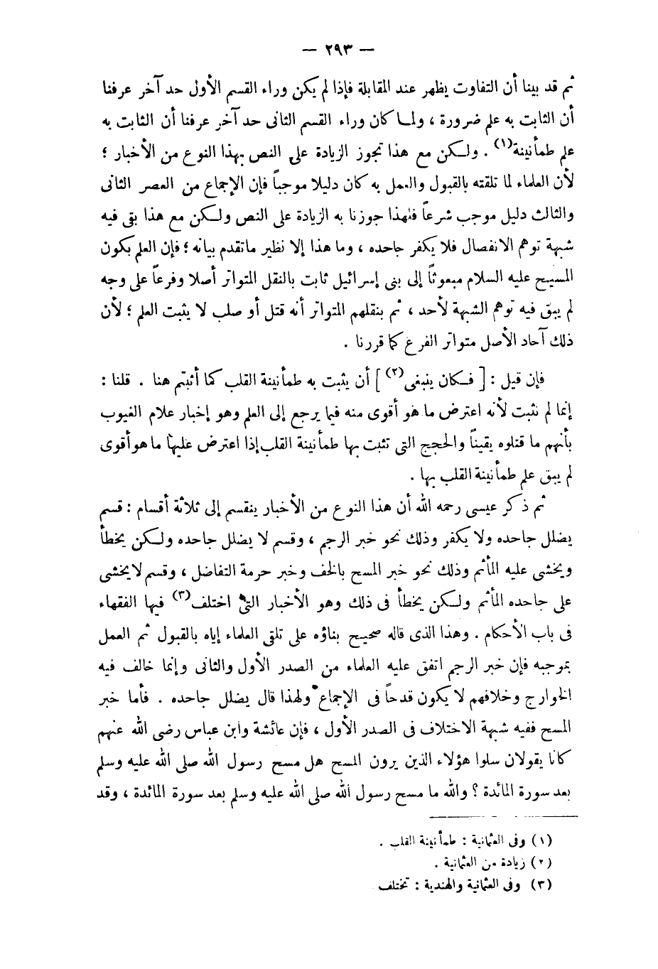 وَلَكِن مَعَ هَذَا تجوز الزِّيَادَة على النَّص بِهَذَا النَّوْع من الْأَخْبَار لِأَن الْعلمَاء لما تَلَقَّتْهُ بِالْقبُولِ وَالْعَمَل بِهِ كَانَ دَلِيلا مُوجبا فَإِن الْإِجْمَاع من الْعَصْر الثَّانِي وَالثَّالِث دَلِيل مُوجب شرعا فَلهَذَا جَوَّزنَا بِهِ الزِّيَادَة على النَّص وَلَكِن مَعَ هَذَا بَقِي فِيهِ شُبْهَة توهم الِانْفِصَال فَلَا يكفر جاحده وَمَا هَذَا إِلَّا نَظِير مَا تقدم بَيَانه فَإِن الْعلم بِكَوْن الْمَسِيح عَلَيْهِ السَّلَام مَبْعُوثًا إِلَى بني إِسْرَائِيل ثَابت بِالنَّقْلِ الْمُتَوَاتر أصلا وفرعا على وَجه لم يبْق فِيهِ توهم الشُّبْهَة لأحد ثمَّ بنقلهم الْمُتَوَاتر أَنه قتل أَو صلب لَا يثبت الْعلم لِأَن ذَلِك آحَاد الأَصْل متواتر الْفَرْع كَمَا قَررنَا