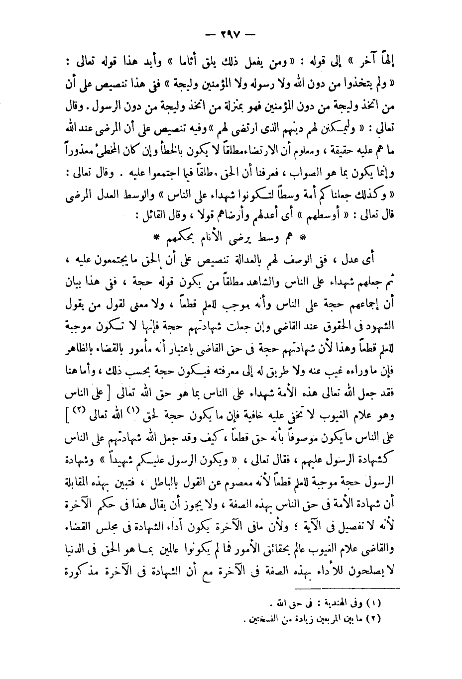 وَقَالَ تَعَالَى {وَكَذَلِكَ جَعَلْنَاكُمْ أمة وسطا لِتَكُونُوا شُهَدَاء على النَّاس} وَالْوسط الْعدْل المرضي قَالَ تَعَالَى {أوسطهم} أَي أعدلهم وأرضاهم قولا وَقَالَ الْقَائِل هم وسط يرضى الْأَنَام بحكمهم أَي عدل فَفِي الْوَصْف لَهُم بِالْعَدَالَةِ تنصيص على أَن الْحق مَا يَجْتَمعُونَ عَلَيْهِ ثمَّ جعلهم شُهَدَاء على النَّاس وَالشَّاهِد مُطلقًا من يكون قَوْله حجَّة فَفِي هَذَا بَيَان أَن إِجْمَاعهم حجَّة على النَّاس وَأَنه مُوجب للْعلم قطعا وَلَا معنى لقَوْل من يَقُول الشُّهُود فِي الْحُقُوق عِنْد القَاضِي وَإِن جعلت شَهَادَتهم حجَّة فَإِنَّهَا لَا تكون مُوجبَة للْعلم قطعا وَهَذَا لِأَن شَهَادَتهم حجَّة فِي حق القَاضِي بِاعْتِبَار أَنه مَأْمُور بِالْقضَاءِ بِالظَّاهِرِ فَإِن مَا وَرَاءه غيب عَنهُ وَلَا طَرِيق لَهُ إِلَى مَعْرفَته فَيكون حجَّة بِحَسب ذَلِك وَأما هُنَا فقد جعل الله تَعَالَى هَذِه الْأمة شُهَدَاء على النَّاس بِمَا هُوَ حق الله تَعَالَى (على النَّاس وَهُوَ علام الغيوب لَا تخفى عَلَيْهِ خافية فَإِن مَا يكون حجَّة لحق الله تَعَالَى) على النَّاس مَا يكون مَوْصُوفا بِأَنَّهُ حق قطعا كَيفَ وَقد جعل الله شَهَادَتهم على النَّاس كَشَهَادَة الرَّسُول عَلَيْهِم فَقَالَ تَعَالَى {وَيكون الرَّسُول عَلَيْكُم شَهِيدا} وَشَهَادَة الرَّسُول حجَّة مُوجبَة للْعلم قطعا لِأَنَّهُ مَعْصُوم عَن القَوْل بِالْبَاطِلِ فَتبين بِهَذِهِ الْمُقَابلَة أَن شَهَادَة الْأمة فِي حق النَّاس بِهَذِهِ الصّفة وَلَا يجوز أَن يُقَال هَذَا فِي حكم الْآخِرَة لِأَنَّهُ لَا تَفْصِيل فِي الْآيَة وَلِأَن مَا فِي الْآخِرَة يكون أَدَاء الشَّهَادَة فِي مجْلِس الْقَضَاء وَالْقَاضِي علام الغيوب عَالم بحقائق الْأُمُور فَمَا لم يَكُونُوا عَالمين بِمَا هُوَ الْحق فِي الدُّنْيَا لَا يصلحون للْأَدَاء بِهَذِهِ الصّفة فِي الْآخِرَة فِي قَوْله تَعَالَى {فَكيف إِذا جِئْنَا من كل أمة بِشَهِيد وَجِئْنَا بك على هَؤُلَاءِ} مَعَ أَن الشَّهَادَة فِي الْآخِرَة مَذْكُورَة