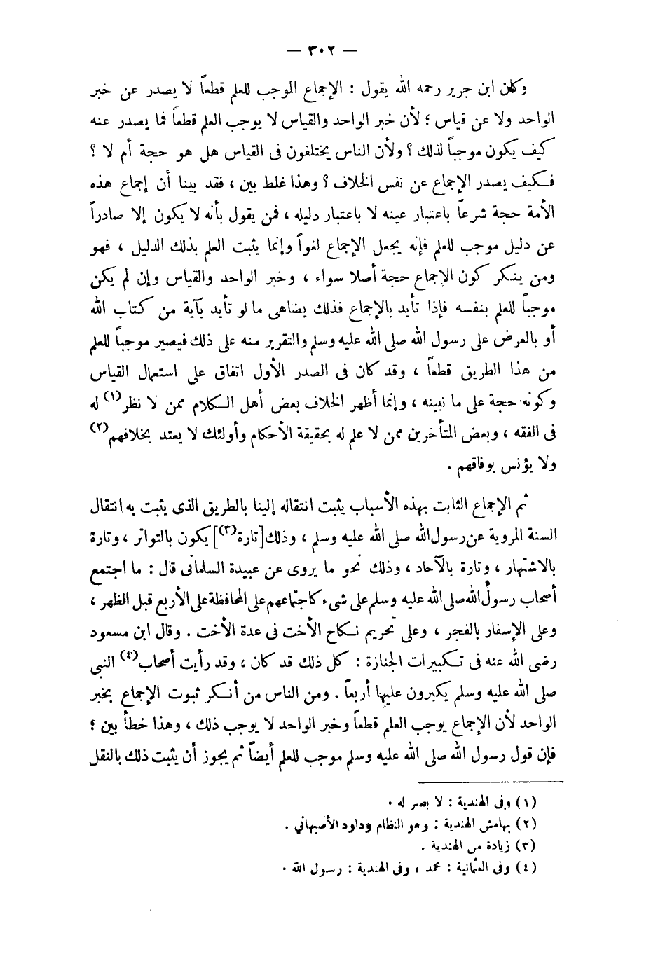 وَكَانَ ابْن جرير رَحمَه الله يَقُول الْإِجْمَاع الْمُوجب للْعلم قطعا لَا يصدر عَن خبر الْوَاحِد وَلَا عَن قِيَاس لِأَن خبر الْوَاحِد وَالْقِيَاس لَا يُوجب الْعلم قطعا فَمَا يصدر عَنهُ كَيفَ يكون مُوجبا لذَلِك وَلِأَن النَّاس يَخْتَلِفُونَ فِي الْقيَاس هَل هُوَ حجَّة أم لَا فَكيف يصدر الْإِجْمَاع عَن نفس الْخلاف وَهَذَا غلط بَين فقد بَينا أَن إِجْمَاع هَذِه الْأمة حجَّة شرعا بِاعْتِبَار عينه لَا بِاعْتِبَار دَلِيله فَمن يَقُول بِأَنَّهُ لَا يكون إِلَّا صادرا عَن دَلِيل مُوجب للْعلم فَإِنَّهُ يَجْعَل الْإِجْمَاع لَغوا وَإِنَّمَا يثبت الْعلم بذلك الدَّلِيل فَهُوَ وَمن يُنكر كَون الْإِجْمَاع حجَّة أصلا سَوَاء وَخبر الْوَاحِد وَالْقِيَاس وَإِن لم يكن مُوجبا للْعلم بِنَفسِهِ فَإِذا تأيد بِالْإِجْمَاع فَذَلِك يضاهي مَا لَو تأيد بِآيَة من كتاب الله أَو بِالْعرضِ على رَسُول الله صلى الله عَلَيْهِ وَسلم والتقرير مِنْهُ على ذَلِك فَيصير مُوجبا للْعلم من هَذَا الطَّرِيق قطعا وَقد كَانَ فِي الصَّدْر الأول اتِّفَاق على اسْتِعْمَال الْقيَاس وَكَونه حجَّة على مَا نبينه وَإِنَّمَا أظهر الْخلاف بعض أهل الْكَلَام مِمَّن لَا نظر لَهُ فِي الْفِقْه وَبَعض الْمُتَأَخِّرين مِمَّن لَا علم لَهُ بِحَقِيقَة الْأَحْكَام وَأُولَئِكَ لَا يعْتد بخلافهم وَلَا يؤنس بوفاقهم
