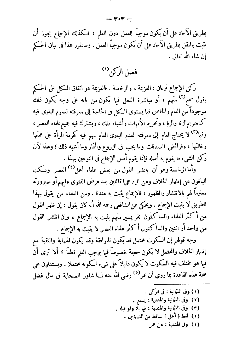 ركن الْإِجْمَاع نَوْعَانِ الْعَزِيمَة والرخصة فالعزيمة هُوَ اتِّفَاق الْكل على الحكم بقول سمع مِنْهُم أَو مُبَاشرَة الْفِعْل فِيمَا يكون من بَابه على وَجه يكون ذَلِك مَوْجُودا من الْعَام وَالْخَاص فِيمَا يَسْتَوِي الْكل فِي الْحَاجة إِلَى مَعْرفَته لعُمُوم الْبلوى فِيهِ كتحريم الزِّنَا والربا وَتَحْرِيم الْأُمَّهَات وَأَشْبَاه ذَلِك ويشترك فِيهِ جَمِيع عُلَمَاء الْعَصْر وَفِيمَا لَا يحْتَاج الْعَام إِلَى مَعْرفَته لعدم الْبلوى الْعَام بهم فِيهِ كَحُرْمَةِ الْمَرْأَة على عَمَّتهَا وخالتها وفرائض الصَّدقَات وَمَا يجب فِي الزروع وَالثِّمَار وَمَا أشبه ذَلِك وَهَذَا لِأَن ركن الشَّيْء مَا يقوم بِهِ أَصله فَإِنَّمَا يقوم أصل الْإِجْمَاع فِي النَّوْعَيْنِ بِهَذَا