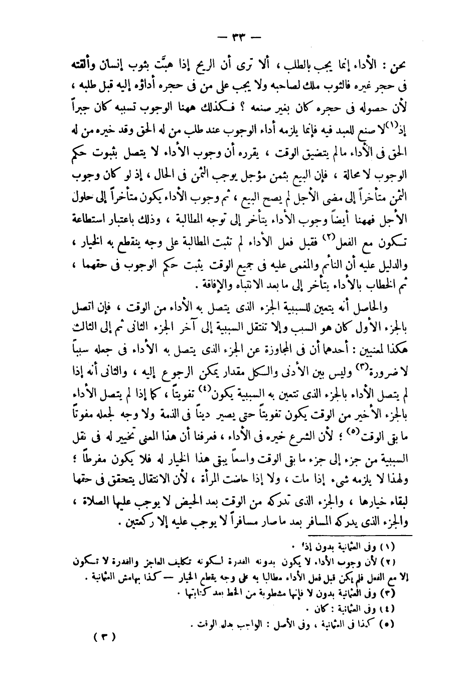 نَحن الْأَدَاء إِنَّمَا يجب بِالطَّلَبِ أَلا ترى أَن الرّيح إِذا هبت بِثَوْب إِنْسَان وألقته فِي حجر غَيره فالثوب ملك لصَاحبه وَلَا يجب على من فِي حجره أَدَاؤُهُ إِلَيْهِ قبل طلبه لِأَن حُصُوله فِي حجره كَانَ بِغَيْر صنعه فَكَذَلِك هَهُنَا الْوُجُوب تسببه كَانَ جبرا إِذْ لَا صنع للْعَبد فِيهِ فَإِنَّمَا يلْزمه أَدَاء الْوُجُوب عِنْد طلب من لَهُ الْحق وَقد خَيره من لَهُ الْحق فِي الْأَدَاء مَا لم يتضيق الْوَقْت يقرره أَن وجوب الْأَدَاء لَا يتَّصل بِثُبُوت حكم الْوُجُوب لَا محَالة فَإِن البيع بِثمن مُؤَجل يُوجب الثّمن فِي الْحَال إِذْ لَو كَانَ وجوب الثّمن مُتَأَخِّرًا إِلَى مُضِيّ الْأَجَل لم يَصح البيع ثمَّ وجوب الْأَدَاء يكون مُتَأَخِّرًا إِلَى حُلُول الْأَجَل فههنا أَيْضا وجوب الْأَدَاء يتَأَخَّر إِلَى توجه الْمُطَالبَة وَذَلِكَ بِاعْتِبَار استطاعة تكون مَعَ الْفِعْل فَقبل فعل الْأَدَاء لم تثبت الْمُطَالبَة على وَجه يَنْقَطِع بِهِ الْخِيَار وَالدَّلِيل عَلَيْهِ أَن النَّائِم والمغمى عَلَيْهِ فِي جَمِيع الْوَقْت يثبت حكم الْوُجُوب فِي حَقّهمَا ثمَّ الْخطاب بِالْأَدَاءِ يتَأَخَّر إِلَى مَا بعد الانتباه والإفاقة