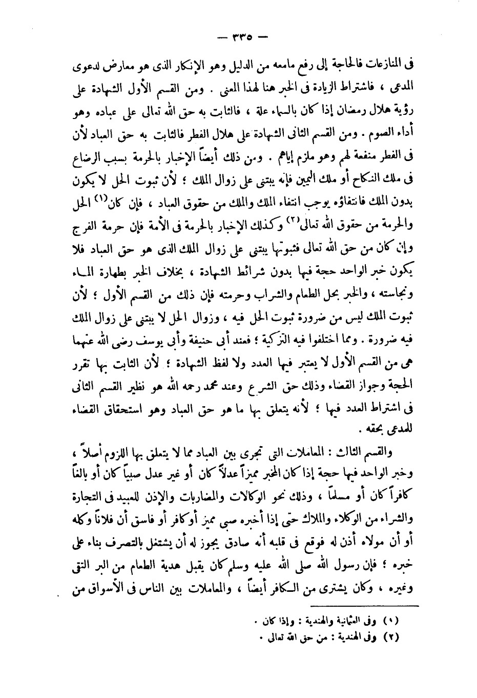 وَمن ذَلِك أَيْضا الْإِخْبَار بِالْحُرْمَةِ بِسَبَب الرَّضَاع فِي ملك النِّكَاح أَو ملك الْيَمين فَإِنَّهُ يبتني على زَوَال الْملك لِأَن ثُبُوت الْحل لَا يكون بِدُونِ الْملك فانتفاؤه يُوجب انْتِفَاء الْملك وَالْملك من حُقُوق الْعباد فَإِن كَانَ الْحل وَالْحُرْمَة من حُقُوق الله تَعَالَى وَكَذَلِكَ الْإِخْبَار بِالْحُرْمَةِ فِي الْأمة فَإِن حُرْمَة الْفرج وَإِن كَانَ من حق الله تَعَالَى فثبوتها يبتني على زَوَال الْملك الَّذِي هُوَ حق الْعباد فَلَا يكون خبر الْوَاحِد حجَّة فِيهَا بِدُونِ شَرَائِط الشَّهَادَة بِخِلَاف الْخَبَر بِطَهَارَة المَاء ونجاسته وَالْخَبَر بِحل الطَّعَام وَالشرَاب وحرمته فَإِن ذَلِك من الْقسم الأول لِأَن ثُبُوت الْملك لَيْسَ من ضَرُورَة ثُبُوت الْحل فِيهِ وَزَوَال الْحل لَا يبتنى على زَوَال الْملك فِيهِ ضَرُورَة