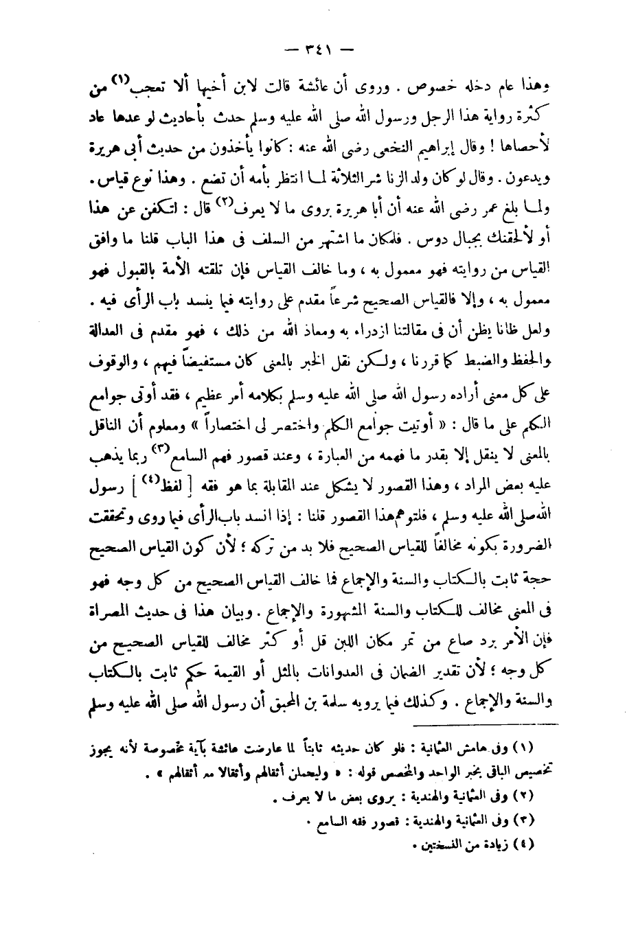 وَلَعَلَّ ظَانّا يظنّ أَن فِي مقالتنا ازدراء بِهِ ومعاذ الله من ذَلِك فَهُوَ مقدم فِي الْعَدَالَة وَالْحِفْظ والضبط كَمَا قَررنَا وَلَكِن نقل الْخَبَر بِالْمَعْنَى كَانَ مستفيضا فيهم وَالْوُقُوف على كل معنى أَرَادَهُ رَسُول الله صلى الله عَلَيْهِ وَسلم بِكَلَامِهِ أَمر عَظِيم فقد أُوتِيَ جَوَامِع الْكَلم على مَا قَالَ أُوتيت جَوَامِع الْكَلم وَاخْتصرَ لي اختصارا وَمَعْلُوم أَن النَّاقِل بِالْمَعْنَى لَا ينْقل إِلَّا بِقدر مَا فهمه من الْعبارَة وَعند قُصُور فهم السَّامع رُبمَا يذهب عَلَيْهِ بعض المُرَاد وَهَذَا الْقُصُور لَا يشكل عِنْد الْمُقَابلَة بِمَا هُوَ فقه (لفظ) رَسُول الله صلى الله عَلَيْهِ وَسلم فلتوهم هَذَا الْقُصُور قُلْنَا إِذا انسد بَاب الرَّأْي فِيمَا رُوِيَ وتحققت الضَّرُورَة بِكَوْنِهِ مُخَالفا للْقِيَاس الصَّحِيح فَلَا بُد من تَركه لِأَن كَون الْقيَاس الصَّحِيح حجَّة ثَابت بِالْكتاب وَالسّنة وَالْإِجْمَاع فَمَا خَالف الْقيَاس الصَّحِيح من كل وَجه فَهُوَ فِي الْمَعْنى مُخَالف للْكتاب وَالسّنة الْمَشْهُورَة وَالْإِجْمَاع