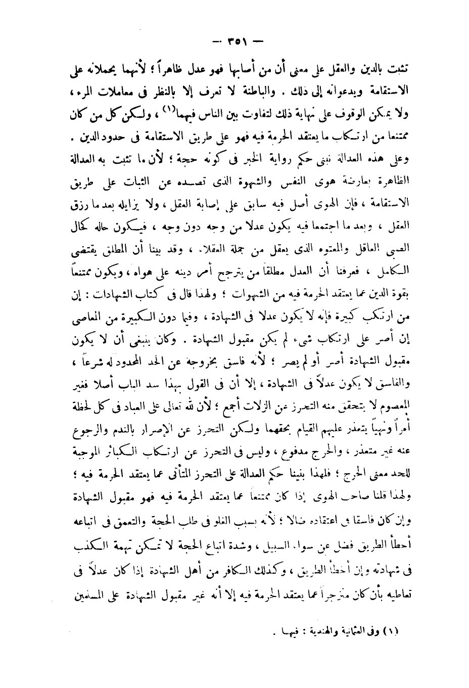 وَكَانَ يَنْبَغِي أَن لَا يكون مَقْبُول الشَّهَادَة أصر أَو لم يصر لِأَنَّهُ فَاسق بِخُرُوجِهِ عَن الْحَد الْمَحْدُود لَهُ شرعا وَالْفَاسِق لَا يكون عدلا فِي الشَّهَادَة إِلَّا أَن فِي القَوْل بِهَذَا سد الْبَاب أصلا فَغير الْمَعْصُوم لَا يتَحَقَّق مِنْهُ التَّحَرُّز عَن الزلات أجمع لِأَن لله تَعَالَى على الْعباد فِي كل لَحْظَة أمرا ونهيا يتَعَذَّر عَلَيْهِم الْقيام بحقهما وَلَكِن التَّحَرُّز عَن الْإِصْرَار بالندم وَالرُّجُوع عَنهُ غير مُتَعَذر والحرج مَدْفُوع وَلَيْسَ فِي التَّحَرُّز عَن ارْتِكَاب الْكَبَائِر الْمُوجبَة للحد معنى الْحَرج فَلهَذَا بنينَا حكم الْعَدَالَة على التَّحَرُّز المتأتي عَمَّا يعْتَقد الْحُرْمَة فِيهِ وَلِهَذَا قُلْنَا صَاحب الْهوى إِذا كَانَ مُمْتَنعا عَمَّا يعْتَقد الْحُرْمَة فِيهِ فَهُوَ مَقْبُول الشَّهَادَة وَإِن كَانَ فَاسِقًا فِي اعْتِقَاده ضَالًّا لِأَنَّهُ بِسَبَب الغلو فِي طلب الْحجَّة والتعمق فِي اتِّبَاعه أَخطَأ الطَّرِيق فضل عَن سَوَاء السَّبِيل وَشدَّة اتِّبَاع الْحجَّة لَا تمكن تُهْمَة الْكَذِب فِي شَهَادَته وَإِن أَخطَأ الطَّرِيق وَكَذَلِكَ الْكَافِر من أهل الشَّهَادَة إِذا كَانَ عدلا فِي تعاطيه بِأَن كَانَ منزجرا عَمَّا يعْتَقد الْحُرْمَة فِيهِ إِلَّا أَنه غير مَقْبُول الشَّهَادَة على الْمُسلمين