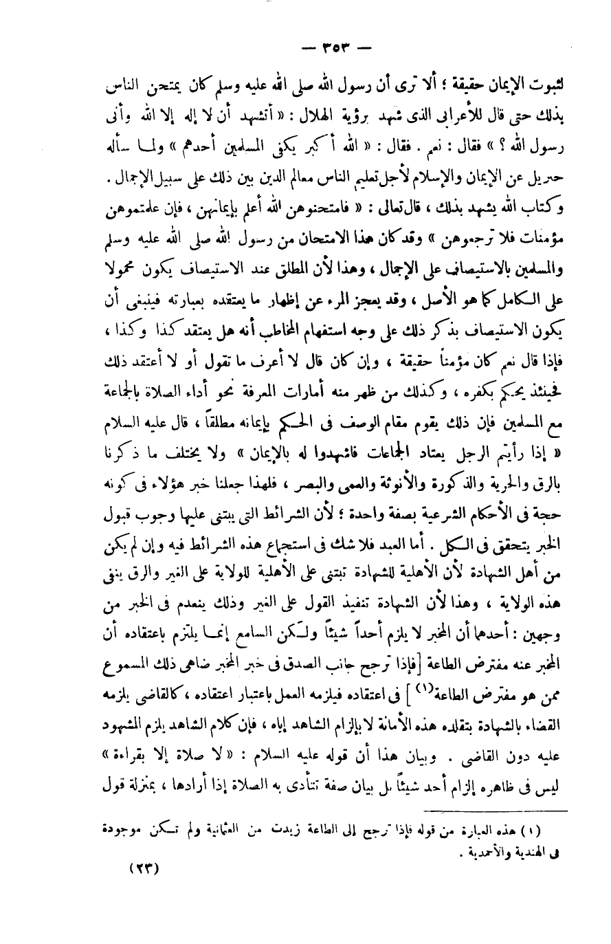 لثُبُوت الْإِيمَان حَقِيقَة أَلا ترى أَن رَسُول الله صلى الله عَلَيْهِ وَسلم كَانَ يمْتَحن النَّاس بذلك حَتَّى قَالَ للأعرابي الَّذِي شهد بِرُؤْيَة الْهلَال أَتَشهد أَن لَا إِلَه إِلَّا الله وَأَنِّي رَسُول الله فَقَالَ نعم