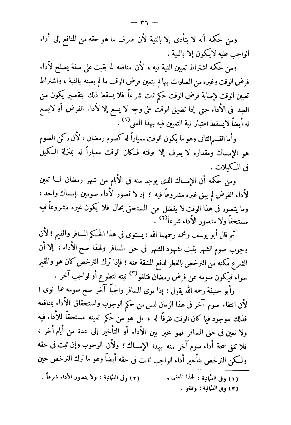وَأَبُو حنيفَة رَحمَه الله يَقُول إِذا نوى الْمُسَافِر وَاجِبا آخر صَحَّ صَوْمه عَمَّا نوى لِأَن انْتِفَاء صَوْم آخر فِي هَذَا الزَّمَان لَيْسَ من حكم الْوُجُوب وَاسْتِحْقَاق الْأَدَاء بمنافعه فَذَلِك مَوْجُود فِيمَا كَانَ الْوَقْت ظرفا لَهُ بل هُوَ من حكم تعينه مُسْتَحقّا للْأَدَاء فِيهِ وَلَا تعين فِي حق الْمُسَافِر فَهُوَ مُخَيّر بَين الْأَدَاء أَو التَّأْخِير إِلَى عدَّة من أَيَّام أخر فَلَا تَنْفِي صِحَة أَدَاء صَوْم آخر مِنْهُ بِهَذَا الْإِمْسَاك وَلِأَن الْوُجُوب وَإِن ثَبت فِي حَقه وَلَكِن التَّرَخُّص بِتَأْخِير أَدَاء الْوَاجِب ثَابت فِي حَقه أَيْضا وَهُوَ مَا ترك التَّرَخُّص حِين