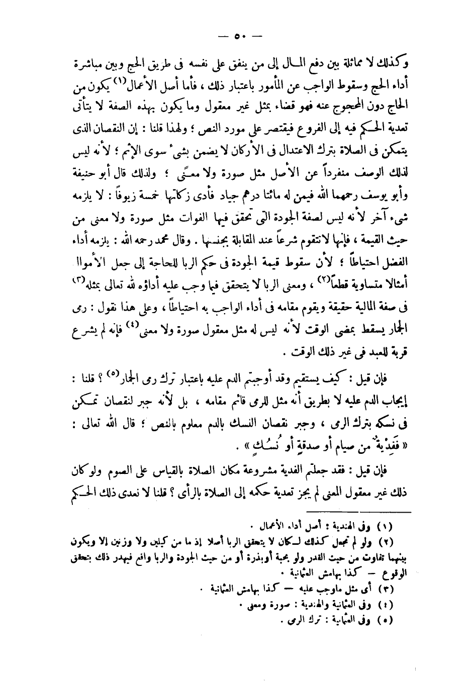 وَكَذَلِكَ لَا مماثلة بَين دفع المَال إِلَى من ينْفق على نَفسه فِي طَرِيق الْحَج وَبَين مُبَاشرَة أَدَاء الْحَج وَسُقُوط الْوَاجِب عَن الْمَأْمُور بِاعْتِبَار ذَلِك فَأَما أصل الْأَعْمَال يكون من الْحَاج دون المحجوج عَنهُ فَهُوَ قَضَاء بِمثل غير مَعْقُول وَمَا يكون بِهَذِهِ الصّفة لَا يَتَأَتَّى تَعديَة الحكم فِيهِ إِلَى الْفُرُوع فَيقْتَصر على مورد النَّص وَلِهَذَا قُلْنَا إِن النُّقْصَان الَّذِي يتَمَكَّن فِي الصَّلَاة بترك الِاعْتِدَال فِي الْأَركان لَا يضمن بِشَيْء سوى الْإِثْم لِأَنَّهُ لَيْسَ لذَلِك الْوَصْف مُنْفَردا عَن الأَصْل مثل صُورَة وَلَا معنى وَلذَلِك قَالَ أَبُو حنيفَة وَأَبُو يُوسُف رحمهمَا الله فِيمَن لَهُ مِائَتَا دِرْهَم جِيَاد فَأدى زَكَاتهَا خَمْسَة زُيُوفًا لَا يلْزمه شَيْء آخر لِأَنَّهُ لَيْسَ لصفة الْجَوْدَة الَّتِي تحقق فِيهَا الْفَوات مثل صُورَة وَلَا معنى من حَيْثُ الْقيمَة فَإِنَّهَا لَا تتقوم شرعا عِنْد الْمُقَابلَة بجنسها