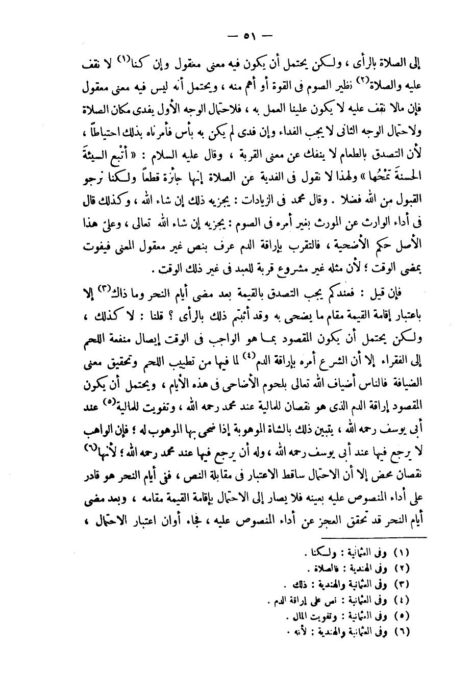 فَإِن قيل فعندكم يجب التَّصَدُّق بِالْقيمَةِ بعد مُضِيّ أَيَّام النَّحْر وَمَا ذَاك إِلَّا بِاعْتِبَار إِقَامَة الْقيمَة مقَام مَا يُضحي بِهِ وَقد أثبتم ذَلِك بِالرَّأْيِ قُلْنَا لَا كَذَلِك وَلَكِن يحْتَمل أَن يكون الْمَقْصُود بِمَا هُوَ الْوَاجِب فِي الْوَقْت إِيصَال مَنْفَعَة اللَّحْم إِلَى الْفُقَرَاء إِلَّا أَن الشَّرْع أمره بإراقة الدَّم لما فِيهَا من تطييب اللَّحْم وَتَحْقِيق معنى الضِّيَافَة فَالنَّاس أضياف الله تَعَالَى بلحوم الْأَضَاحِي فِي هَذِه الْأَيَّام وَيحْتَمل أَن يكون الْمَقْصُود إِرَاقَة الدَّم الَّذِي هُوَ نُقْصَان للمالية عِنْد مُحَمَّد رَحمَه الله وتفويت للمالية عِنْد أبي يُوسُف رَحمَه الله يتَبَيَّن ذَلِك بِالشَّاة الْمَوْهُوبَة إِذا ضحى بهَا الْمَوْهُوب لَهُ فَإِن الْوَاهِب لَا يرجع فِيهَا عِنْد أبي يُوسُف رَحمَه الله وَله أَن يرجع فِيهَا عِنْد مُحَمَّد رَحمَه الله لِأَنَّهَا نُقْصَان مَحْض إِلَّا أَن الِاحْتِمَال سَاقِط الِاعْتِبَار فِي مُقَابلَة النَّص فَفِي أَيَّام النَّحْر هُوَ قَادر على أَدَاء الْمَنْصُوص عَلَيْهِ بِعَيْنِه فَلَا يُصَار إِلَى الِاحْتِمَال بِإِقَامَة الْقيمَة مقَامه وَبعد مُضِيّ أَيَّام النَّحْر قد تحقق الْعَجز عَن أَدَاء الْمَنْصُوص عَلَيْهِ فجَاء أَوَان اعْتِبَار الِاحْتِمَال