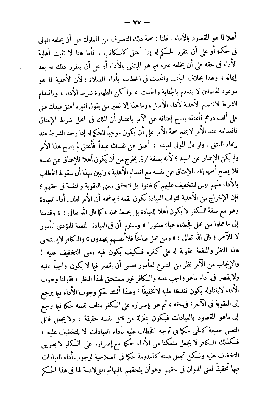 وَلَو قَالَ الْمولى لعَبْدِهِ أعتق عَن نَفسك عبدا فَأعتق لم يَصح هَذَا الْأَمر وَلم يكن الْإِعْتَاق عَن العَبْد لِأَنَّهُ بِصفة الرّقّ يخرج من أَن يكون أَهلا للإعتاق عَن نَفسه فَلَا يَصح أمره إِيَّاه بِالْإِعْتَاقِ عَن نَفسه مَعَ انعدام الْأَهْلِيَّة وَتبين بِهَذَا أَن سُقُوط الْخطاب بِالْأَدَاءِ عَنْهُم لَيْسَ للتَّخْفِيف عَلَيْهِم كَمَا ظنُّوا بل لتحَقّق معنى الْعقُوبَة والنقمة فِي حَقهم فَإِن الْإِخْرَاج من الْأَهْلِيَّة لثواب الْعِبَادَة يكون نقمة يُوضحهُ أَن الْأَمر لطلب أَدَاء الْعِبَادَة وَهُوَ مَعَ صفة الْكفْر لَا يكون أَهلا لِلْعِبَادَةِ بل يحبط عمله كَمَا قَالَ الله تَعَالَى {وَقدمنَا إِلَى مَا عمِلُوا من عمل فجعلناه هباء منثورا} وَمَعْلُوم أَن فِي الْعِبَادَة الْمَنْفَعَة للمؤدي الْمَأْمُور لَا للْآمِر قَالَ الله تَعَالَى {وَمن عمل صَالحا فلأنفسهم يمهدون} وَالْكَافِر لَا يسْتَحق هَذَا النّظر وَالْمَنْفَعَة عُقُوبَة لَهُ على كفره فَكيف يكون فِيهِ معنى التَّخْفِيف عَلَيْهِ والإيجاب من الْآمِر نظر من الشَّرْع للْمَأْمُور فَعَسَى أَن يقصر فِيمَا لَا يكون وَاجِبا عَلَيْهِ وَلَا يقصر فِي أَدَاء مَا هُوَ وَاجِب عَلَيْهِ وَالْكَافِر غير مُسْتَحقّ لهَذَا النّظر فقولنا وجوب الْأَدَاء لَا يتَنَاوَلهُ يكون تَغْلِيظًا عَلَيْهِ لَا تَخْفِيفًا وَلِهَذَا أثبتنا حكم وجوب الْأَدَاء فِيمَا يرجع إِلَى الْعقُوبَة فِي الْآخِرَة فِي حَقه ثمَّ هُوَ بإصراره على الْكفْر متْلف نَفسه حكما فِيمَا يرجع إِلَى مَا هُوَ الْمَقْصُود بالعبادات فَيكون بِمَنْزِلَة من قتل نَفسه حَقِيقَة وَلَا يَجْعَل قَاتل النَّفس حَقِيقَة كالحي حكما فِي توجه الْخطاب عَلَيْهِ بأَدَاء الْعِبَادَات لَا للتَّخْفِيف عَلَيْهِ فَكَذَلِك الْكَافِر لَا يَجْعَل مُتَمَكنًا من الْأَدَاء حكما مَعَ إصراره على الْكفْر لَا بطرِيق التَّخْفِيف عَلَيْهِ وَلَكِن تجْعَل ذمَّته كالمعدومة حكما فِي الصلاحية لوُجُوب أَدَاء الْعِبَادَات فِيهَا تَحْقِيقا لِمَعْنى الهوان فِي حَقهم الله تَعَالَى قَالَ {إِن هم إِلَّا كالأنعام بل هم أضلّ سَبِيلا} ثمَّ الْخطاب وَهُوَ أَن يلحقهم بالبهائم الَّتِي لَا ذمَّة لَهَا فِي هَذَا الحكم