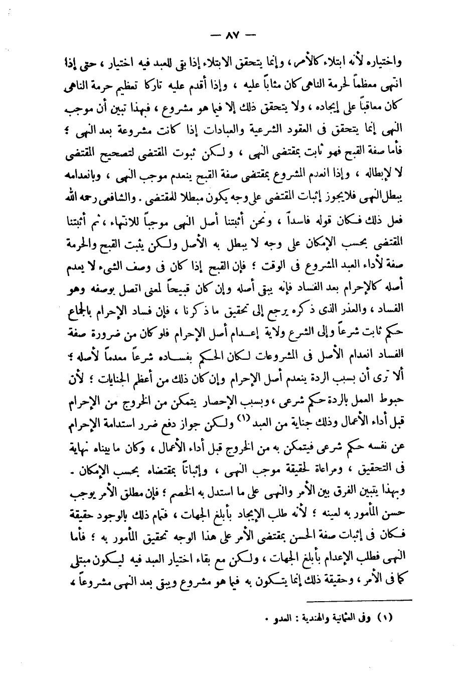 واختياره لِأَنَّهُ ابتلاء كالأمر وَإِنَّمَا يتَحَقَّق الِابْتِلَاء إِذا بَقِي للْعَبد فِيهِ اخْتِيَار حَتَّى إِذا انْتهى مُعظما لحُرْمَة الناهي كَانَ مثابا عَلَيْهِ وَإِذا أقدم عَلَيْهِ تَارِكًا تَعْظِيم حُرْمَة الناهي كَانَ معاقبا على إيجاده وَلَا يتَحَقَّق ذَلِك إِلَّا فِيمَا هُوَ مَشْرُوع فَبِهَذَا تبين أَن مُوجب النَّهْي إِنَّمَا يتَحَقَّق فِي الْعُقُود الشَّرْعِيَّة والعبادات إِذا كَانَت مَشْرُوعَة بعد النَّهْي فَأَما صفة الْقبْح فَهُوَ ثَابت بِمُقْتَضى النَّهْي وَلَكِن ثُبُوت الْمُقْتَضى لتصحيح الْمُقْتَضى لَا لإبطاله وَإِذا انْعَدم الْمَشْرُوع بِمُقْتَضى صفة الْقبْح يَنْعَدِم مُوجب النَّهْي وبانعدامه يبطل النَّهْي فَلَا يجوز إِثْبَات الْمُقْتَضى على وَجه يكون مُبْطلًا للمقتضي