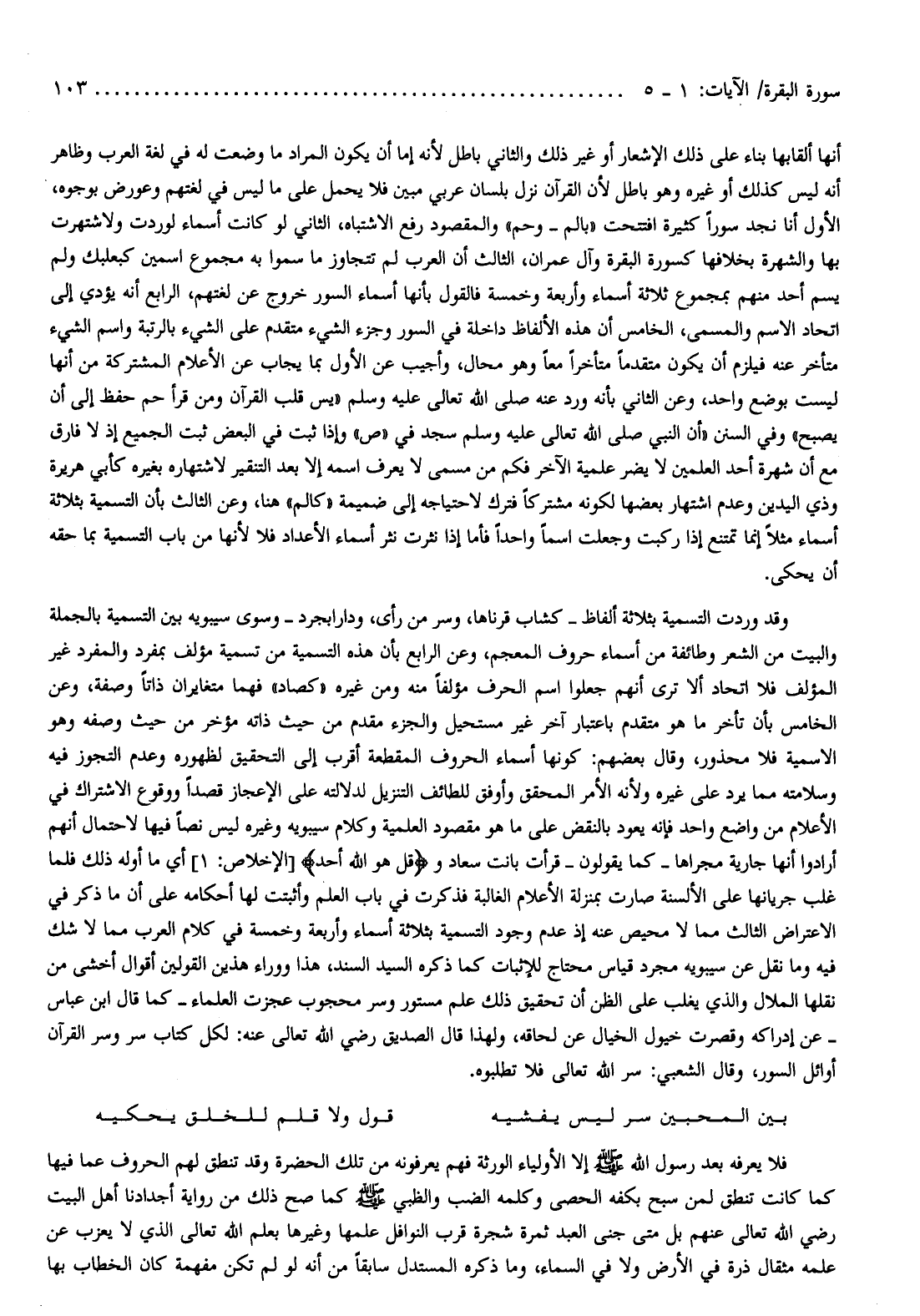 وقد وردت التسمية بثلاثة ألفاظ- كشاب قرناها، وسر من رأى، ودارابجرد- وسوى سيبويه بين التسمية بالجملة والبيت من الشعر وطائفة من أسماء حروف المعجم، وعن الرابع بأن هذه التسمية من تسمية مؤلف بمفرد والمفرد غير المؤلف فلا اتحاد ألا ترى أنهم جعلوا اسم الحرف مؤلفا منه ومن غيره «كصاد» فهما متغايران ذاتا وصفة، وعن الخامس بأن تأخر ما هو متقدم باعتبار آخر غير مستحيل والجزء مقدم من حيث ذاته مؤخر من حيث وصفه وهو الاسمية فلا محذور، وقال بعضهم: كونها أسماء الحروف المقطعة أقرب إلى التحقيق لظهوره وعدم التجوز فيه وسلامته مما يرد على غيره ولأنه الأمر المحقق وأوفق للطائف التنزيل لدلالته على الإعجاز قصدا ووقوع الاشتراك في الأعلام من واضع واحد فإنه يعود بالنقض على ما هو مقصود العلمية وكلام سيبويه وغيره ليس نصا فيها لاحتمال أنهم أرادوا أنها جارية مجراها- كما يقولون- قرأت بانت سعاد وقُلْ هُوَ اللَّهُ أَحَدٌ [الإخلاص: 1] أي ما أوله ذلك فلما غلب جريانها على الألسنة صارت بمنزلة الأعلام الغالبة فذكرت في باب العلم وأثبتت لها أحكامه على أن ما ذكر في الاعتراض الثالث مما لا محيص عنه إذ عدم وجود التسمية بثلاثة أسماء وأربعة وخمسة في كلام العرب مما لا شك فيه وما نقل عن سيبويه مجرد قياس محتاج للإثبات كما ذكره السيد السند، هذا ووراء هذين القولين أقوال أخشى من نقلها الملال والذي يغلب على الظن أن تحقيق ذلك علم مستور وسر محجوب عجزت العلماء- كما قال ابن عباس- عن إدراكه وقصرت خيول الخيال عن لحاقه، ولهذا قال الصديق رضي الله تعالى عنه: لكل كتاب سر وسر القرآن أوائل السور، وقال الشعبي: سر الله تعالى فلا تطلبوه.