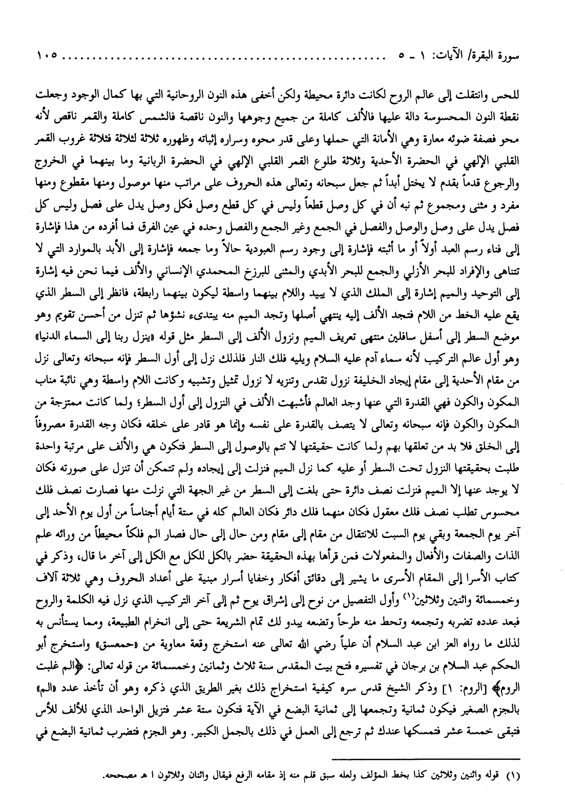 للحس وانتقلت إلى عالم الروح لكانت دائرة محيطة ولكن أخفى هذه النون الروحانية التي بها كمال الوجود وجعلت نقطة النون المحسوسة دالة عليها فالألف كاملة من جميع وجوهها والنون ناقصة فالشمس كاملة والقمر ناقص لأنه محو فصفة ضوئه معارة وهي الأمانة التي حملها وعلى قدر محوه وسراره إثباته وظهوره ثلاثة لثلاثة فثلاثة غروب القمر القلبي الإلهي في الحضرة الأحدية وثلاثة طلوع القمر القلبي الإلهي في الحضرة الربانية وما بينهما في الخروج والرجوع قدما بقدم لا يختل أبدا ثم جعل سبحانه وتعالى هذه الحروف على مراتب منها موصول ومنها مقطوع ومنها مفرد ومثنى ومجموع ثم نبه أن في كل وصل قطعا وليس في كل قطع وصل فكل وصل يدل على فصل وليس كل فصل يدل على وصل والوصل والفصل في الجمع وغير الجمع والفصل وحده في عين الفرق فما أفرده من هذا فإشارة إلى فناء رسم العبد أولا أو ما أثبته فإشارة إلى وجود رسم العبودية حالا وما جمعه فإشارة إلى الأبد بالموارد التي لا تتناهى والإفراد للبحر الأزلي والجمع للبحر الأبدي والمثنى للبرزخ المحمدي الإنساني والألف فيما نحن فيه إشارة إلى التوحيد والميم إشارة إلى الملك الذي لا يبيد واللام بينهما واسطة ليكون بينهما رابطة، فانظر إلى السطر الذي يقع عليه الخط من اللام فتجد الألف إليه ينتهي أصلها وتجد الميم منه يبتدىء نشؤها ثم تنزل من أحسن تقويم وهو موضع السطر إلى أسفل سافلين منتهى تعريف الميم ونزول الألف إلى السطر مثل قوله «ينزل ربنا إلى السماء الدنيا» وهو أول عالم التركيب لأنه سماء آدم عليه السلام ويليه فلك النار فلذلك نزل إلى أول السطر فإنه سبحانه وتعالى نزل من مقام الأحدية إلى مقام إيجاد الخليفة نزول تقدس وتنزيه لا نزول تمثيل وتشبيه وكانت اللام واسطة وهي نائبة مناب المكون والكون فهي القدرة التي عنها وجد العالم فأشبهت الألف في النزول إلى أول السطر ولما كانت ممتزجة من المكون والكون فإنه سبحانه وتعالى لا يتصف بالقدرة على نفسه وإنما هو قادر على خلقه فكان وجه القدرة مصروفا إلى الخلق فلا بد من تعلقها بهم ولما كانت حقيقتها لا تتم بالوصول إلى السطر فتكون هي والألف على مرتبة واحدة طلبت بحقيقتها النزول تحت السطر أو عليه كما نزل الميم فنزلت إلى إيجاده ولم تتمكن أن تنزل على صورته فكان لا يوجد عنها إلا الميم فنزلت نصف دائرة حتى بلغت إلى السطر من غير الجهة التي نزلت منها فصارت نصف فلك محسوس تطلب نصف فلك معقول فكان منهما فلك دائر فكان العالم كله في ستة أيام أجناسا من أول يوم الأحد إلى آخر يوم الجمعة وبقي يوم السبت للانتقال من مقام إلى مقام ومن حال إلى حال فصار الم فلكا محيطا من ورائه علم الذات والصفات والأفعال والمفعولات فمن قرأها بهذه الحقيقة حضر بالكل للكل مع الكل إلى آخر ما قال، وذكر في كتاب الإسراء إلى المقام الأسرى ما يشير إلى دقائق أفكار وخفايا أسرار مبنية على أعداد الحروف وهي ثلاثة آلاف وخمسمائة واثنين وثلاثين (¬1) وأول التفصيل من نوح إلى إشراق يوح ثم إلى آخر التركيب الذي نزل فيه الكلمة والروح فبعد عدده تضربه وتجمعه وتحط منه طرحا وتضعه