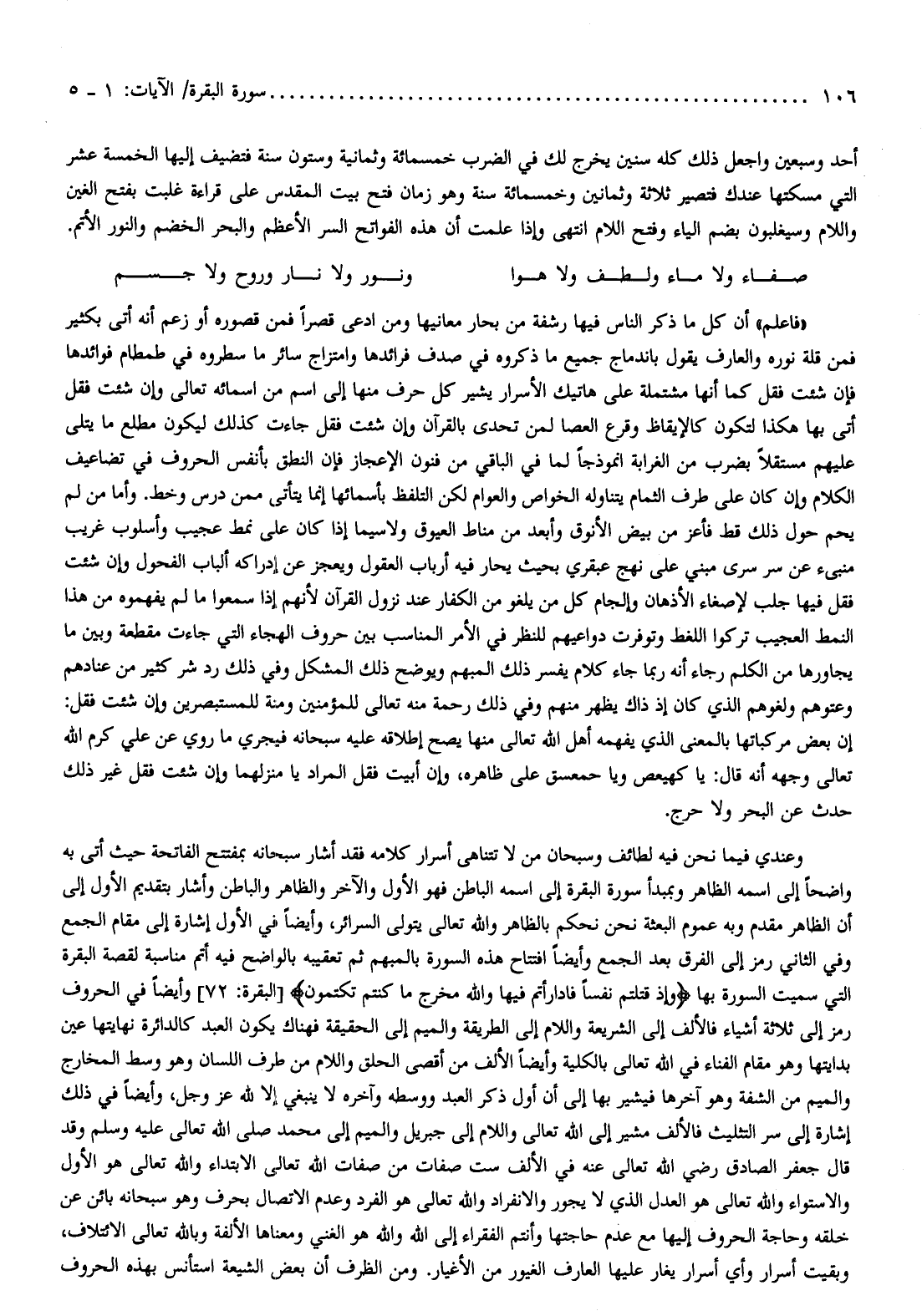 «فاعلم» أن كل ما ذكر الناس فيها رشفة من بحار معانيها ومن ادعى قصرا فمن قصوره أو زعم أنه أتى بكثير فمن قلة نوره والعارف يقول باندماج جميع ما ذكروه في صدف فرائدها وامتزاج سائر ما سطروه في طمطام فوائدها فإن شئت فقل كما أنها مشتملة على هاتيك الأسرار يشير كل حرف منها إلى اسم من أسمائه تعالى وإن شئت فقل أتى بها هكذا لتكون كالإيقاظ وقرع العصا لمن تحدى بالقرآن وإن شئت فقل جاءت كذلك ليكون مطلع ما يتلى عليهم مستقلا بضرب من الغرابة أنموذجا لما في الباقي من فنون الإعجاز فإن النطق بأنفس الحروف في تضاعيف الكلام وإن كان على طرف الثمام يتناوله الخواص والعوام لكن التلفظ بأسمائها إنما يتأتى ممن درس وخط. وأما من لم يحم حول ذلك قط فأعز من بيض الأنوق وأبعد من مناط العيوق ولا سيما إذا كان على نمط عجيب وأسلوب غريب منبىء عن سر سرى مبني على نهج عبقري بحيث يحار فيه أرباب العقول ويعجز عن إدراكه ألباب الفحول وإن شئت فقل فيها جلب لإصغاء الأذهان وإلجام كل من يلغو من الكفار عند نزول القرآن لأنهم إذا سمعوا ما لم يفهموه من هذا النمط العجيب تركوا اللغط وتوفرت دواعيهم للنظر في الأمر المناسب بين حروف الهجاء التي جاءت مقطعة وبين ما يجاورها من الكلم رجاء أنه ربما جاء كلام يفسر ذلك المبهم ويوضح ذلك المشكل وفي ذلك رد شر كثير من عنادهم وعتوهم ولغوهم الذي كان إذ ذاك يظهر منهم وفي ذلك رحمة منه تعالى للمؤمنين ومنة للمستبصرين وإن شئت فقل: