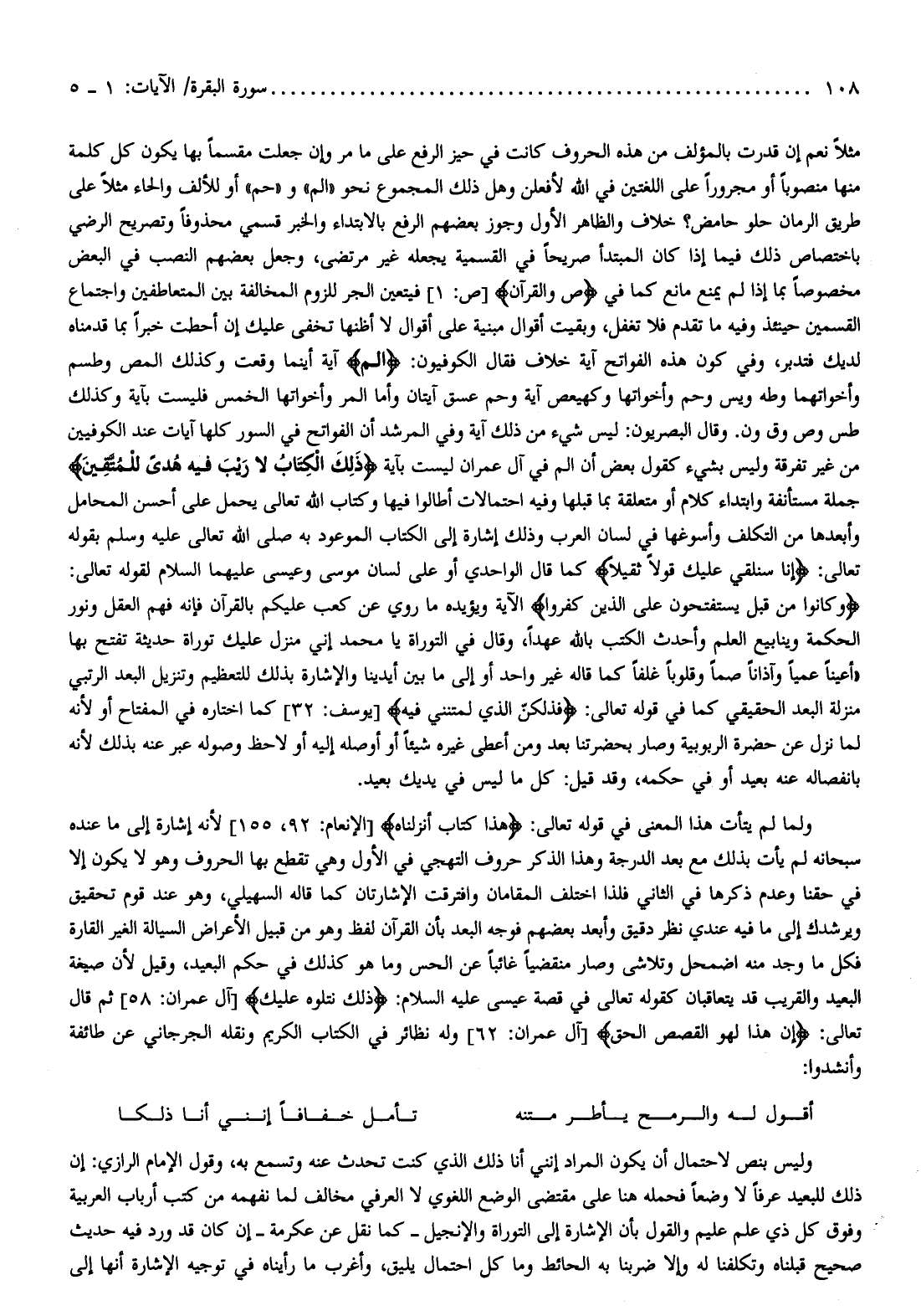 ولما لم يتأت هذا المعنى في قوله تعالى: هذا كِتابٌ أَنْزَلْناهُ [الإنعام: 92، 155] لأنه إشارة إلى ما عنده سبحانه لم يأت بذلك مع بعد الدرجة وهذا الذكر حروف التهجي في الأول وهي تقطع بها الحروف وهو لا يكون إلا في حقنا وعدم ذكرها في الثاني فلذا اختلف المقامان وافترقت الإشارتان كما قاله السهيلي، وهو عند قوم تحقيق ويرشدك إلى ما فيه عندي نظر دقيق وأبعد بعضهم فوجه البعد بأن القرآن لفظ وهو من قبيل الأعراض السيالة الغير القارة فكل ما وجد منه اضمحل وتلاشى وصار منقضيا غائبا عن الحس وما هو كذلك في حكم البعيد، وقيل لأن صيغة البعيد والقريب قد يتعاقبان كقوله تعالى في قصة عيسى عليه السلام: ذلِكَ نَتْلُوهُ عَلَيْكَ [آل عمران: 58] ثم قال تعالى: إِنَّ هذا لَهُوَ الْقَصَصُ الْحَقُّ [آل عمران: 62] وله نظائر في الكتاب الكريم ونقله الجرجاني عن طائفة وأنشدوا:
