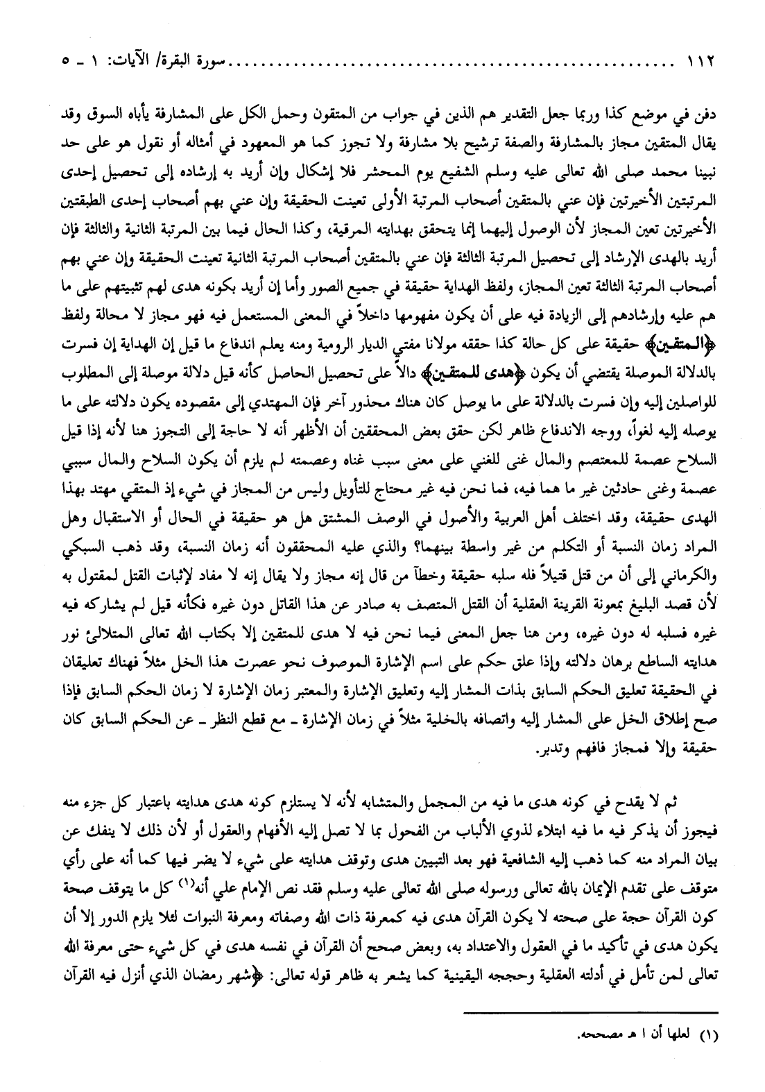 دفن في موضع كذا وربما جعل التقدير هم الذين في جواب من المتقون وحمل الكل على المشارفة يأباه السوق وقد يقال المتقين مجاز بالمشارفة والصفة ترشيح بلا مشارفة ولا تجوز كما هو المعهود في أمثاله أو نقول هو على حد نبينا محمد صلى الله تعالى عليه وسلم الشفيع يوم المحشر فلا إشكال وإن أريد به إرشاده إلى تحصيل إحدى المرتبتين الأخيرتين فإن عني بالمتقين أصحاب المرتبة الأولى تعينت الحقيقة وإن عني بهم أصحاب إحدى الطبقتين الأخيرتين تعين المجاز لأن الوصول إليهما إنما يتحقق بهدايته المرقية، وكذا الحال فيما بين المرتبة الثانية والثالثة فإن أريد بالهدى الإرشاد إلى تحصيل المرتبة الثالثة فإن عني بالمتقين أصحاب المرتبة الثانية تعينت الحقيقة وإن عني بهم أصحاب المرتبة الثالثة تعين المجاز، ولفظ الهداية حقيقة في جميع الصور وأما إن أريد بكونه هدى لهم تثبيتهم على ما هم عليه وإرشادهم إلى الزيادة فيه على أن يكون مفهوما داخلا في المعنى المستعمل فيه فهو مجاز لا محالة ولفظ المتقين حقيقة على كل حالة كذا حققه مولانا مفتي الديار الرومية ومنه يعلم اندفاع ما قيل إن الهداية إن فسرت بالدلالة الموصلة يقتضي أن يكون هُدىً لِلْمُتَّقِينَ دالا على تحصيل الحاصل كأنه قيل دلالة موصلة إلى المطلوب للواصلين إليه وإن فسرت بالدلالة على ما يوصل كان هناك محذور آخر فإن المهتدي إلى مقصوده يكون دلالته على ما يوصله إليه لغوا، ووجه الاندفاع ظاهر لكن حقق بعض المحققين أن الأظهر أنه لا حاجة إلى التجوز هنا لأنه إذا قيل السلاح عصمة للمعتصم والمال غنى للغني على معنى سبب غناه وعصمته لم يلزم أن يكون السلاح والمال سببي عصمة وغنى حادثين غير ما هما فيه، فما نحن فيه غير محتاج للتأويل وليس من المجاز في شيء إذ المتقي مهتد بهذا الهدى حقيقة، وقد اختلف أهل العربية والأصول في الوصف المشتق هل هو حقيقة في الحال أو الاستقبال وهل المراد زمان النسبة أو التكلم من غير واسطة بينهما؟ والذي عليه المحققون أنه زمان النسبة، وقد ذهب السبكي والكرماني إلى أن من قتل قتيلا فله سلبه حقيقة وخطآ من قال إنه مجاز ولا يقال إنه لا مفاد لإثبات القتل لمقتول به لأن قصد البليغ بمعونة القرينة العقلية أن القتل المتصف به صادر عن هذا القاتل دون غيره فكأنه قيل لم يشاركه فيه غيره فسلبه له دون غيره، ومن هنا جعل المعنى فيما نحن فيه لا هدى للمتقين إلا بكتاب الله تعالى المتلالئ نور هدايته الساطع برهان دلالته وإذا علق حكم على اسم الإشارة الموصوف نحو عصرت هذا الخل مثلا فهناك تعليقان في الحقيقة تعليق الحكم السابق بذات المشار إليه وتعليق الإشارة والمعتبر زمان الإشارة لا زمان الحكم السابق فإذا صح إطلاق الخل على المشار إليه واتصافه بالخلية مثلا في زمان الإشارة- مع قطع النظر- عن الحكم السابق كان حقيقة وإلا فمجاز فافهم وتدبر.