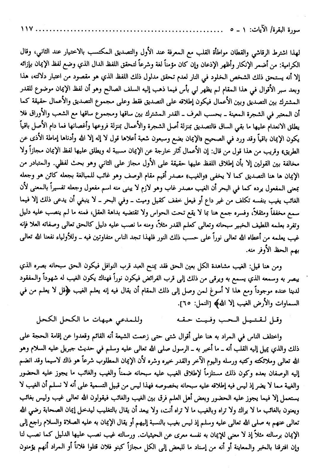 لهذا اشترط الرقاشي والقطان مواطأة القلب مع المعرفة عند الأول والتصديق المكتسب بالاختيار عند الثاني، وقال الكرامية: من أضمر الإنكار وأظهر الإذعان وإن كان مؤمنا لغة وشرعا لتحقق اللفظ الدال الذي وضع لفظ الإيمان بإزائه إلا أنه يستحق ذلك الشخص الخلود في النار لعدم تحقق مدلول ذلك اللفظ الذي هو مقصود من اعتبار دلالته، هذا وبعد سبر الأقوال في هذا المقام لم يظهر لي بأس فيما ذهب إليه السلف الصالح وهو أن لفظ الإيمان موضوع للقدر المشترك بين التصديق وبين الأعمال فيكون إطلاقه على التصديق فقط وعلى مجموع التصديق والأعمال حقيقة كما أن المعتبر في الشجرة المعينة- بحسب العرف- القدر المشترك بين ساقها ومجموع ساقها مع الشعب والأوراق فلا يطلق الانعدام عليها ما بقي الساق فالتصديق بمنزلة أصل الشجرة والأعمال بمنزلة فروعها وأغصانها فما دام الأصل باقيا يكون الإيمان باقيا