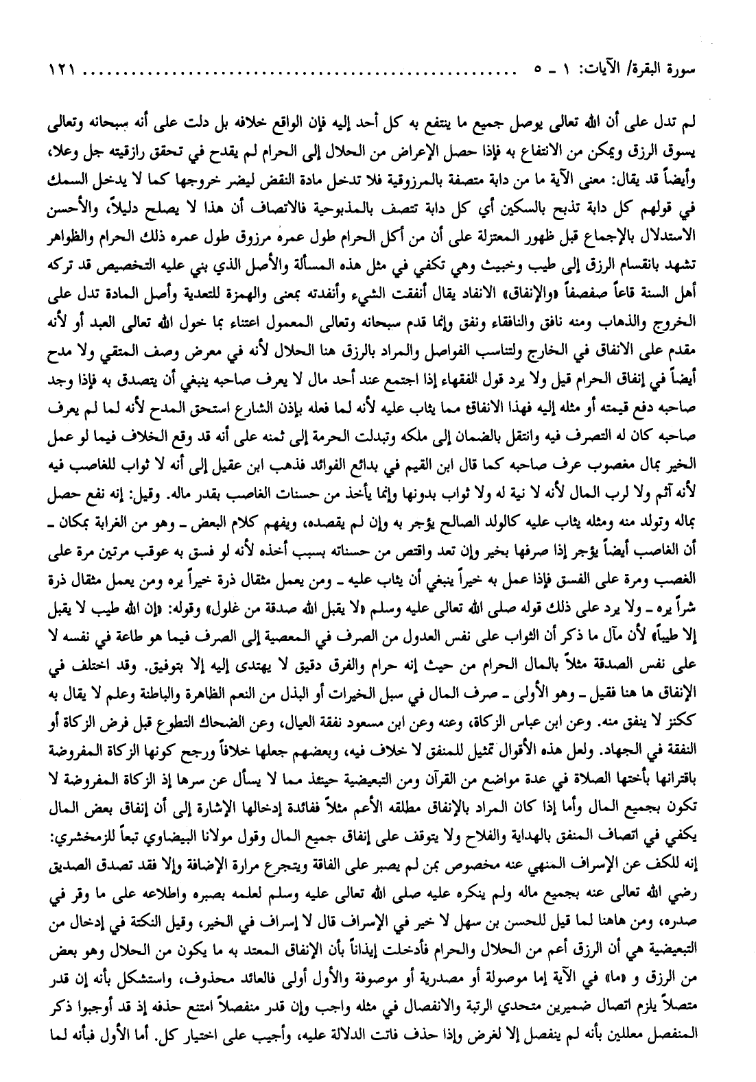 لم تدل على أن الله تعالى يوصل جميع ما ينتفع به كل أحد إليه فإن الواقع خلافه بل دلت على أنه سبحانه وتعالى يسوق الرزق ويمكن من الانتفاع به فإذا حصل الإعراض من الحلال إلى الحرام لم يقدح في تحقق رازقيته جل وعلا، وأيضا قد يقال: معنى الآية ما من دابة متصفة بالمرزوقية فلا تدخل مادة النقض ليضر خروجها كما لا يدخل السمك في قولهم كل دابة تذبح بالسكين أي كل دابة تتصف بالمذبوحية فالاتصاف أن هذا لا يصلح دليلا، والأحسن الاستدلال بالإجماع قبل ظهور المعتزلة على أن من أكل الحرام طول عمره مرزوق طول عمره ذلك الحرام والظواهر تشهد بانقسام الرزق إلى طيب وخبيث وهي تكفي في مثل هذه المسألة والأصل الذي بني عليه التخصيص قد تركه أهل السنة قاعا صفصفا «والإنفاق» الانفاد يقال أنفقت الشيء وأنفدته بمعنى والهمزة للتعدية وأصل المادة تدل على الخروج والذهاب ومنه نافق والنافقاء ونفق وإنما قدم سبحانه وتعالى المعمول اعتناء بما خول الله تعالى العبد أو لأنه مقدم على الانفاق في الخارج ولتناسب الفواصل والمراد بالرزق هنا الحلال لأنه في معرض وصف المتقي ولا مدح أيضا في إنفاق الحرام قيل ولا يرد قول الفقهاء إذا اجتمع عند أحد مال لا يعرف صاحبه ينبغي أن يتصدق به فإذا وجد صاحبه دفع قيمته أو مثله إليه فهذا الانفاق مما يثاب عليه لأنه لما فعله بإذن الشارع استحق المدح لأنه لما لم يعرف صاحبه كان له التصرف فيه وانتقل بالضمان إلى ملكه وتبدلت الحرمة إلى ثمنه على أنه قد وقع الخلاف فيما لو عمل الخير بمال مغصوب عرف صاحبه كما قال ابن القيم في بدائع الفوائد فذهب ابن عقيل إلى أنه لا ثواب للغاصب فيه لأنه آثم ولا لرب المال لأنه لا نية له ولا ثواب بدونها وإنما يأخذ من حسنات الغاصب بقدر ماله. وقيل: إنه نفع حصل بماله وتولد منه ومثله يثاب عليه كالولد الصالح يؤجر به وإن لم يقصده، ويفهم كلام البعض- وهو من الغرابة بمكان- أن الغاصب أيضا يؤجر إذا صرفها بخير وإن تعد واقتص من حسناته بسبب أخذه لأنه لو فسق به عوقب مرتين مرة على الغصب ومرة على الفسق فإذا عمل به خيرا ينبغي أن يثاب عليه- ومن يعمل مثقال ذرة خيرا يره ومن يعمل مثقال ذرة شرا يره- ولا يرد على ذلك