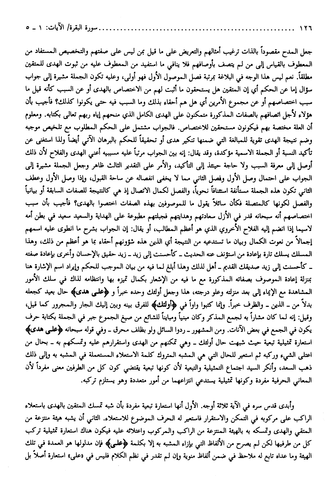 جعل المدح مقصودا بالذات ترغيب أمثالهم والتعريض على ما قيل بمن ليس على صفتهم والتخصيص المستفاد من المعطوف بالقياس إلى من لم يتصف بأوصافهم فلا ينافي ما استفيد من المعطوف عليه من ثبوت الهدى للمتقين مطلقا. نعم ليس هذا الوجه في البلاغة بمرتبة فصل الموصول الأول فهو أولى، وعليه تكون الجملة مشيرة إلى جواب سؤال إما عن الحكم أي إن المتقين هل يستحقون ما أثبت لهم من الاختصاص بالهدى أو عن السبب كأنه قيل ما سبب اختصاصهم أو عن مجموع الأمرين أي هل هم أحقاء بذلك وما السبب فيه حتى يكونوا كذلك؟ فأجيب بأن هؤلاء لأجل اتصافهم بالصفات المذكورة متمكنون على الهدى الكامل الذي منحهم إياه ربهم تعالى بكتابه. ومعلوم أن العلة مختصة بهم فيكونون مستحقين للاختصاص. فالجواب مشتمل على الحكم المطلوب مع تلخيص موجبه وضم نتيجة الهدى تقوية للمبالغة التي ضمنها تنكير هدى أو تحقيقا للحكم بالبرهان الآتي أيضا ولذا استغنى عن تأكيد النسبة أو الجملة الاسمية مؤكدة، وقد يقال: إنه بين الجواب مرتبا عليه مسببيه أعني الهدى والفلاح لأن ذلك أوصل إلى معرفة السبب ولا حاجة حينئذ إلى التأكيد، والأمر على التقدير الثالث ظاهر وجعل الجملة مشيرة إلى الجواب على احتمال وصل الأول وفصل الثاني مما لا يخفى انفصاله عن ساحة القبول، وإذا وصل الأول وعطف الثاني تكون هذه الجملة مستأنفة استئنافا نحويا، والفصل لكمال الاتصال إذ هي كالنتيجة للصفات السابقة أو بيانيا والفصل لكونها كالمتصلة فكأن سائلا يقول ما للموصوفين بهذه الصفات اختصوا بالهدى؟ فأجيب بأن سبب اختصاصهم أنه سبحانه قدر في الأزل سعادتهم وهدايتهم فجبلتهم مطبوعة على الهداية