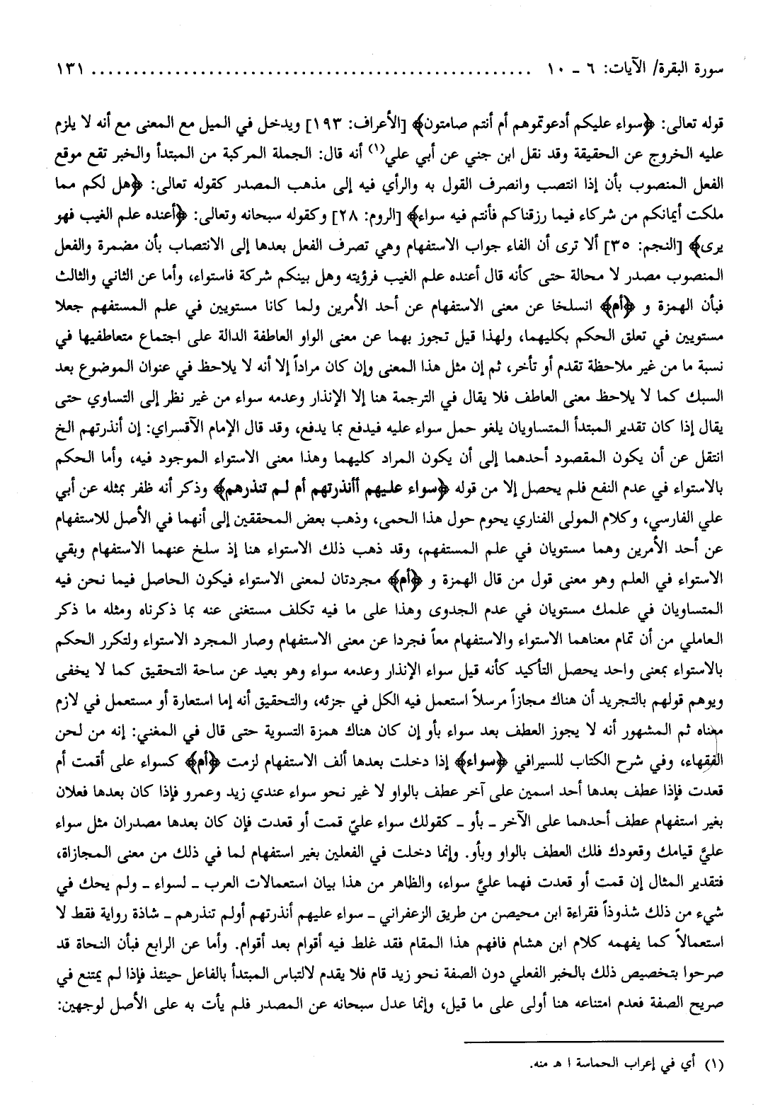 قوله تعالى: سَواءٌ عَلَيْكُمْ أَدَعَوْتُمُوهُمْ أَمْ أَنْتُمْ صامِتُونَ [الأعراف: 193] ويدخل في الميل مع المعنى مع أنه لا يلزم عليه الخروج عن الحقيقة وقد نقل ابن جني عن أبي علي (¬1) أنه قال: الجملة المركبة من المبتدأ والخبر تقع موقع الفعل المنصوب بأن إذا انتصب وانصرف القول به والرأي فيه إلى مذهب المصدر كقوله تعالى: هَلْ لَكُمْ مِنْ ما مَلَكَتْ أَيْمانُكُمْ مِنْ شُرَكاءَ فِي ما رَزَقْناكُمْ فَأَنْتُمْ فِيهِ سَواءٌ [الروم: 28] وكقوله سبحانه وتعالى: أَعِنْدَهُ عِلْمُ الْغَيْبِ فَهُوَ يَرى [النجم: 35] ألا ترى أن الفاء جواب الاستفهام وهي تصرف الفعل بعدها إلى الانتصاب بأن مضمرة والفعل المنصوب مصدر لا محالة حتى كأنه قال أعنده علم الغيب فرؤيته وهل بينكم شركة فاستواء، وأما عن الثاني والثالث فبأن الهمزة وأَمْ انسلخا عن معنى الاستفهام عن أحد الأمرين ولما كانا مستويين في علم المستفهم جعلا مستويين في تعلق الحكم بكليهما، ولهذا قيل تجوز بهما عن معنى الواو العاطفة الدالة على اجتماع متعاطفيها في نسبة ما من غير ملاحظة تقدم أو تأخر، ثم إن مثل هذا المعنى وإن كان مرادا إلا أنه لا يلاحظ في عنوان الموضوع بعد السبك كما لا يلاحظ معنى العاطف فلا يقال في الترجمة هنا إلا الإنذار وعدمه سواء من غير نظر إلى التساوي حتى يقال إذا كان تقدير المبتدأ المتساويان يلغو حمل سواء عليه فيدفع بما يدفع، وقد قال الإمام الآقسراي: إن أنذرتهم إلخ انتقل عن أن يكون المقصود أحدهما إلى أن يكون المراد كليهما وهذا معنى الاستواء الموجود فيه، وأما الحكم بالاستواء في عدم النفع فلم يحصل إلا من قوله سَواءٌ عَلَيْهِمْ أَأَنْذَرْتَهُمْ أَمْ لَمْ تُنْذِرْهُمْ وذكر أنه ظفر بمثله عن أبي علي الفارسي، وكلام المولى الفناري يحوم حول هذا الحمى، وذهب بعض المحققين إلى