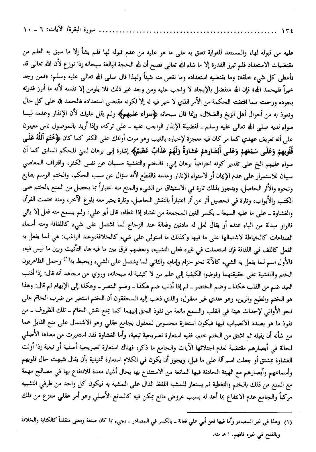 فإن الله متفضل بالإيجاد لا واجب عليه ومن وجد غير ذلك فلا يلومن إلا نفسه لأنه ما أبرز قدرته بجوده ورحمته مما اقتضته الحكمة من الأمر الذي لا خير فيه له إلا لكونه مقتضى استعداده فالحمد لله على كل حال ونعوذ به من أحوال أهل الزيغ والضلال، وإنما قال سبحانه سَواءٌ عَلَيْهِمْ ولم يقل عليك لأن الإنذار وعدمه ليسا سواء لديه صلى الله تعالى عليه وسلم- لفضيلة الإنذار الواجب عليه- على تركه، وإذا أريد بالموصول ناس معينون على أنه تعريف عهدي كما مر كان فيه معجزة لإخباره بالغيب وهو موت أولئك على الكفر كما كان خَتَمَ اللَّهُ عَلى قُلُوبِهِمْ وَعَلى سَمْعِهِمْ وَعَلى أَبْصارِهِمْ غِشاوَةٌ وَلَهُمْ عَذابٌ عَظِيمٌ إشارة إلى برهان لميّ للحكم السابق كما أن سواء عليهم إلخ على تقدير كونه اعتراضا برهان إني، فالختم والتغشية مسببان عن نفس الكفر، واقتراف المعاصي سببان للاستمرار على عدم الإيمان أو لاستواء الإنذار وعدمه فالقطع لأنه سؤال عن سبب الحكم، والختم الوسم بطابع ونحوه والأثر الحاصل، ويتجوز بذلك تارة في الاستيثاق من الشيء والمنع منه اعتبارا بما يحصل من المنع بالختم على الكتب والأبواب، وتارة في تحصيل أثر عن أثر اعتبارا بالنقش الحاصل، وتارة يعتبر معه بلوغ الآخر، ومنه ختمت القرآن والغشاوة- على ما عليه السبعة- بكسر الغين المجمعة من غشاه إذا غطاه، قال أبو علي: ولم يسمع منه فعل إلا يائي فالواو مبدلة من الياء عنده أو يقال لعل له مادتين وفعالة عند الزجاج لما اشتمل على شيء كاللفافة ومنه أسماء الصناعات كالخياطة لاشتمالها على ما فيها وكذلك ما استولى على شيء كالخلافة، وعند الراغب: هي لما يفعل به الفعل كاللف في اللفافة فإن استعملت في غيره فعلى التشبيه، وبعضهم فرق بين ما فيه هاء التأنيث وبين ما ليس فيه، فالأول اسم لما يفعل به الشيء كالآلة نحو حزام وإمام، والثاني لما يشتمل على الشيء ويحيط به (¬1) وحمل الظاهريون الختم والتغشية على حقيقتهما وفوضوا الكيفية إلى علم من لا كيفية له سبحانه، وروي عن مجاهد أنه قال: إذا أذنب العبد ضم من القلب هكذا- وضم الخنصر- ثم إذا أذنب ضم هكذا- وضم البنصر- وهكذا إلى الإبهام ثم قال: وهذا هو الختم والطبع والرين، وهو عندي غير معقول، والذي ذهب إليه المحققون أن الختم استعير من ضرب الخاتم على نحو الأواني لإحداث هيئة في القلب والسمع مانعة من نفوذ الحق إليهما كما يمنع نقش الخاتم- تلك الظروف- من نفوذ ما هو بصدد الانصباب فيها فيكون استعارة محسوس لمعقول بجامع عقلي وهو الاشتمال على منع القابل عما من شأنه أن يقبله ثم اشتق من الختم ختم، ففيه استعارة تصريحية تبعية، وأما الغشاوة فقد استعيرت من معناها الأصلي لحالة في أبصارهم مقتضية لعدم اجتلائها الآيات والجامع ما ذكر، فهناك استعارة تصريحية أصلية أو تبعية إذا أولت الغشاوة بمشتق أو جعلت اسم آلة على ما قيل، ويجوز أن يكون في الكلام استعارة تمثيلية بأن يقال شبهت حال قلوبهم وأسماعهم وأبصارهم مع الهيئة الحادثة فيها المانعة من الاستنفاع بها بحال أشياء معدة للانتفاع بها في مصالح مهمة مع المنع من ذلك بالختم والتغطية ثم يستعار للمشبه اللفظ الدال على المشبه به فيكون كل واحد من طرفي التشبيه مركبا والجامع عدم الانتفاع بما أعد له بسبب عروض مانع يمكن فيه كالمانع الأصلي وهو أمر عقلي منتزع من تلك