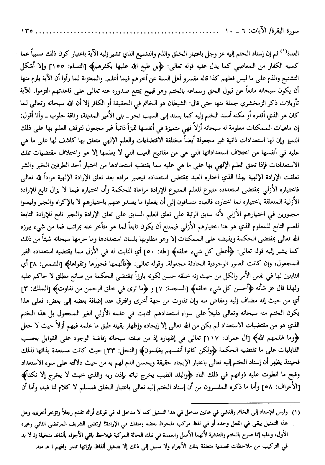 إن ماهيات الممكنات معلومة له سبحانه أزلا فهي متميزة في أنفسها تميزا ذاتيا غير مجعول لتوقف العلم بها على ذلك التميز وإن لها استعدادات ذاتية غير مجعولة أيضا مختلفة الاقتضاءات والعلم الإلهي متعلق بها كاشف لها على ما هي عليه في أنفسها من اختلاف استعداداتها التي هي من مفاتيح الغيب التي لا يعلمها إلا هو واختلاف مقتضيات تلك الاستعدادات فإذا تعلق العلم الإلهي بها على ما هي عليه مما يقتضيه استعدادها من اختيار أحد الطرفين الخير والشر تعلقت الإرادة الإلهية بهذا الذي اختاره العبد بمقتضى استعداده فيصير مراده بعد تعلق الإرادة الإلهية مرادا لله تعالى فاختياره الأزلي بمقتضى استعداده متبوع للعلم المتبوع للإرادة مراعاة للحكمة وأن اختياره فيما لا يزال تابع للإرادة الأزلية المتعلقة باختياره لما اختاره، فالعباد منساقون إلى أن يفعلوا ما يصدر عنهم باختيارهم لا بالإكراه والجبر وليسوا مجبورين في اختيارهم الأزلي لأنه سابق الرتبة على تعلق العلم السابق على تعلق الإرادة والجبر تابع للإرادة التابعة للعلم التابع للمعلوم الذي هو هنا اختيارهم الأزلي فيمتنع أن يكون تابعا لما هو متأخر عنه بمراتب فما من شيء يبرزه الله تعالى بمقتضى الحكمة ويفيضه على الممكنات إلا وهو مطلوبها بلسان استعدادها وما حرمها سبحانه شيئا من ذلك كما يشير إليه قوله تعالى: أَعْطى كُلَّ شَيْءٍ خَلْقَهُ [طه: 50] أي الثابت له في الأزل مما يقتضيه استعداده الغير المجعول، وإن كانت الصور الوجودية الحادثة مجعولة. وقوله تعالى: فَأَلْهَمَها فُجُورَها وَتَقْواها [الشمس: 8] أي الثابتين لها في نفس الأمر والكل من حيث إنه خلقه حسن لكونه بارزا بمقتضى الحكمة من صانع مطلق لا حاكم عليه ولهذا قال عز شأنه أَحْسَنَ كُلَّ شَيْءٍ خَلَقَهُ [السجدة: 7] وما تَرى فِي خَلْقِ الرَّحْمنِ مِنْ تَفاوُتٍ [الملك: 3] أي من حيث إنه مضاف إليه ومفاض منه وإن تفاوت من جهة أخرى وافترق عند إضافة بعضه إلى بعض، فعلى هذا يكون الختم منه سبحانه وتعالى دليلا على سواء استعدادهم الثابت في علمه الأزلي الغير المجعول بل هذا الختم الذي هو من مقتضيات الاستعداد لم يكن من الله تعالى إلا إيجاده وإظهار يقينه طبق ما علمه فيهم أزلا حيث لا جعل ما ظَلَمَهُمُ اللَّهُ