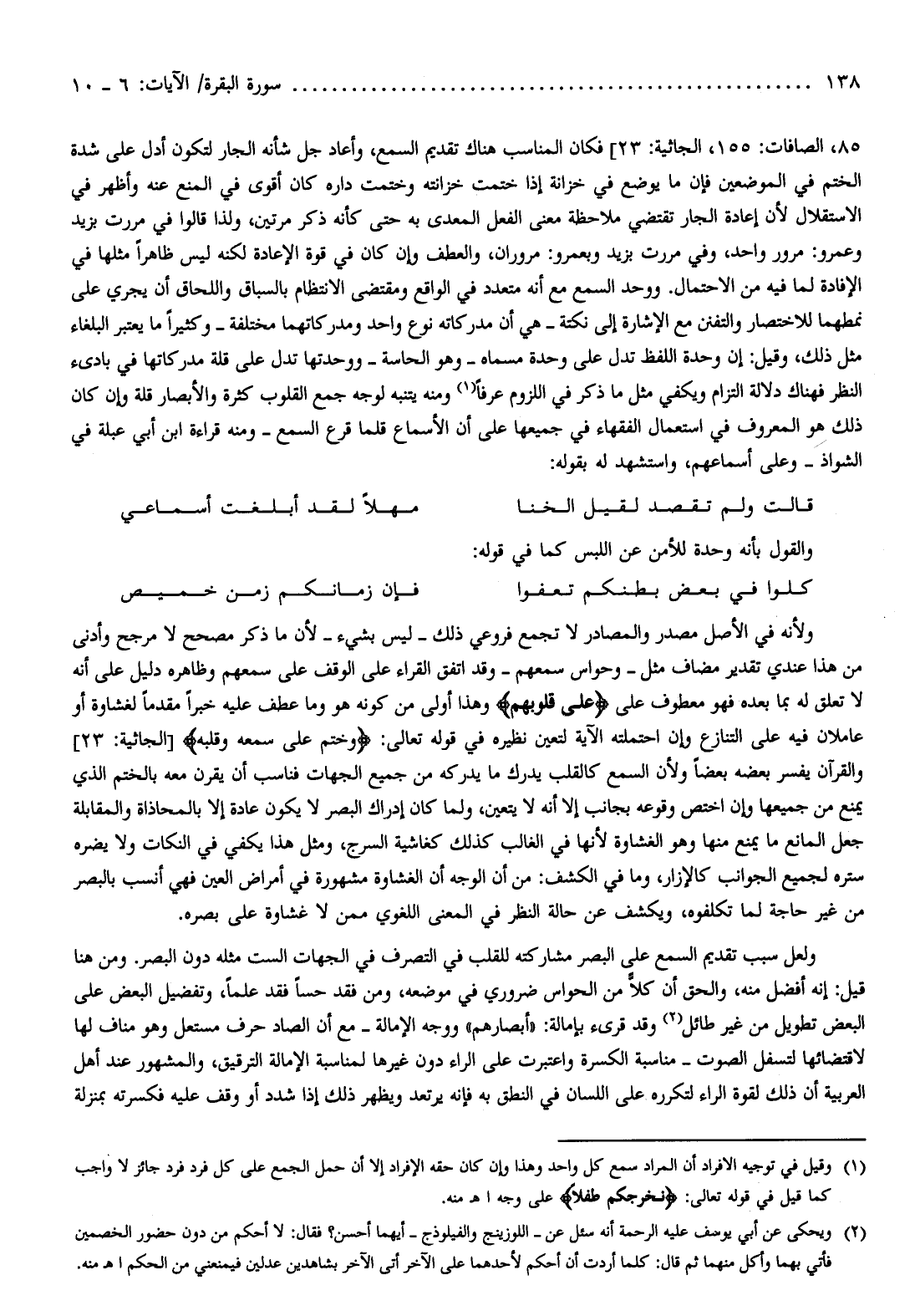 ولأنه في الأصل مصدر والمصادر لا تجمع فروعي ذلك- ليس بشيء- لأن ما ذكر مصحح لا مرجح وأدنى من هذا عندي تقدير مضاف مثل- وحواس سمعهم- وقد اتفق القراء على الوقف على سمعهم وظاهره دليل على أنه لا تعلق له بما بعده فهو معطوف على عَلى قُلُوبِهِمْ وهذا أولى من كونه هو وما عطف عليه خبرا مقدما لغشاوة أو عاملان فيه على التنازع وإن احتملته الآية لتعين نظيره في قوله تعالى: وَخَتَمَ عَلى سَمْعِهِ وَقَلْبِهِ [الجاثية: 23] والقرآن يفسر بعضه بعضا ولأن السمع كالقلب يدرك ما يدركه من جميع الجهات فناسب أن يقرن معه بالختم الذي يمنع من جميعها وإن اختص وقوعه بجانب إلا أنه لا يتعين، ولما كان إدراك البصر لا يكون عادة إلا بالمحاذاة والمقابلة جعل المانع ما يمنع منها وهو الغشاوة لأنها في الغالب كذلك كغاشية السرج، ومثل هذا يكفي في النكات ولا يضره ستره لجميع الجوانب كالإزار، وما في الكشف: من أن الوجه أن الغشاوة مشهورة في أمراض العين فهي أنسب بالبصر من غير حاجة لما تكلفوه، ويكشف عن حالة النظر في المعنى اللغوي ممن لا غشاوة على بصره.