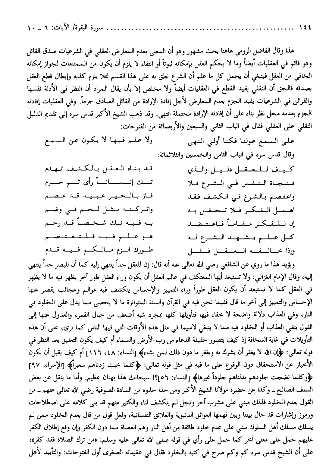 ويؤيد هذا ما روي عن الشافعي رضي الله تعالى عنه أنه قال: إن للعقل حدا ينتهي إليه كما أن للبصر حدا ينتهي إليه، وقال الإمام الغزالي: ولا تستبعد أيها المعتكف في عالم العقل أن يكون وراء العقل طور آخر يظهر فيه ما لا يظهر في العقل كما لا تستبعد أن يكون العقل طورا وراء التمييز والإحساس ينكشف فيه عوالم وعجائب يقصر عنها الإحساس والتمييز إلى آخر ما قال ففيما نحن فيه في القرآن والسنة المتواترة ما لا يحصى مما يدل على الخلود في النار، وفي العذاب دلالة واضحة لا خفاء فيها فتأويلها كلها بمجرد شبه أضعف من حبال القمر، والعدول عنها إلى القول بنفي العذاب أو الخلود فيه مما لا ينبغي لا سيما في مثل هذه الأوقات التي فيها الناس كما ترى، على أن هذه التأويلات في غاية السخافة إذ كيف يتصور حقيقة الدعاء من رب الأرض والسماء أم كيف يكون التعليق بعد النظر في قوله تعالى: إِنَّ اللَّهَ لا يَغْفِرُ أَنْ يُشْرَكَ بِهِ وَيَغْفِرُ ما دُونَ ذلِكَ لِمَنْ يَشاءُ [النساء: 48، 116] أم كيف يقبل أن يكون الأخبار عن الاستحقاق دون الوقوع على ما فيه في مثل قوله تعالى: كُلَّما خَبَتْ زِدْناهُمْ سَعِيراً [الإسراء: 97] كُلَّما نَضِجَتْ جُلُودُهُمْ بَدَّلْناهُمْ جُلُوداً غَيْرَها [النساء: 56] ؟! سبحانك هذا بهتان عظيم. وأما ما ينقل عن بعض السلف الصالح- وكذا عن حضرة مولانا الشيخ الأكبر ومن حذا حذوه من السادة الصوفية رضي الله تعالى عنهم- من القول بعدم الخلود فذلك مبني على مشرب آخر وتجل لم ينكشف لنا، والكثير منهم قد بنى كلامه على اصطلاحات ورموز وإشارات قد حال بيننا وبين فهمها العوائق الدنيوية والعلائق النفسانية، ولعل قول من قال بعدم الخلود ممن لم يسلك مسلك أهل السلوك مبني على عدم خلود طائفة من أهل النار وهم العصاة مما دون الكفر وإن وقع إطلاق الكفر عليهم حمل على معنى آخر كما حمل على رأي في
