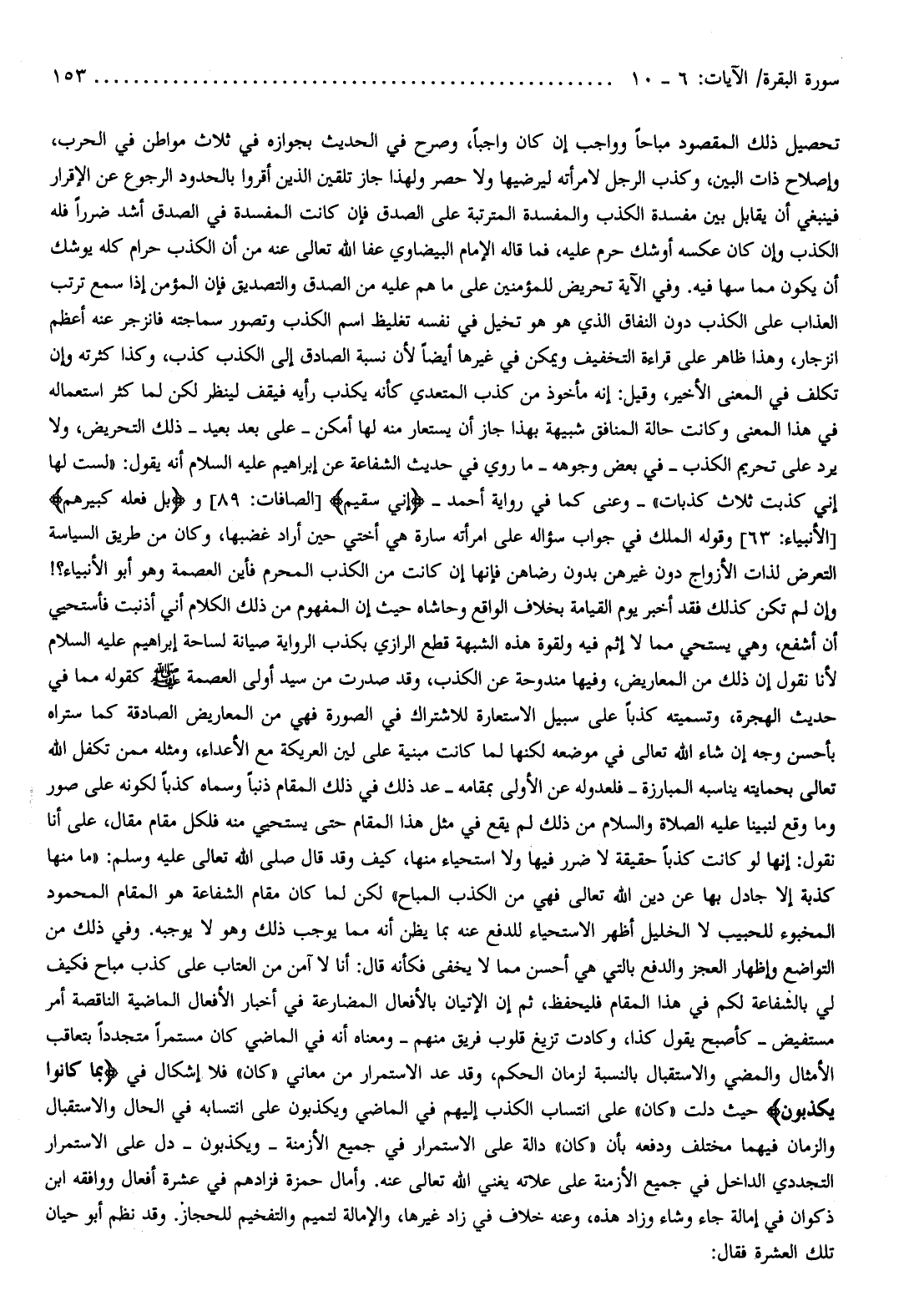 تحصيل ذلك المقصود مباحا وواجب إن كان واجبا، وصرح في الحديث بجوازه في ثلاث مواطن في الحرب، وإصلاح ذات البين، وكذب الرجل لامرأته ليرضيها ولا حصر ولهذا جاز تلقين الذين أقروا بالحدود الرجوع عن الإقرار فينبغي أن يقابل بين مفسدة الكذب والمفسدة المترتبة على الصدق فإن كانت المفسدة في الصدق أشد ضررا فله الكذب وإن كان عكسه أو شك حرم عليه، فما قاله الإمام البيضاوي عفا الله تعالى عنه من أن الكذب حرام كله يوشك أن يكون مما سها فيه. وفي الآية تحريض للمؤمنين على ما هم عليه من الصدق والتصديق فإن المؤمن إذا سمع ترتب العذاب على الكذب دون النفاق الذي هو هو تخيل في نفسه تغليظ اسم الكذب وتصور سماجته فانزجر عنه أعظم انزجار، وهذا ظاهر على قراءة التخفيف ويمكن في غيرها أيضا لأن نسبة الصادق إلى الكذب كذب، وكذا كثرته وإن تكلف في المعنى الأخير، وقيل: إنه مأخوذ من كذب المتعدي كأنه يكذب رأيه فيقف لينظر لكن لما كثر استعماله في هذا المعنى وكانت حالة المنافق شبيهة بهذا جاز أن يستعار منه لها أمكن- على بعد بعيد- ذلك التحريض، ولا يرد على تحريم الكذب- في بعض وجوهه- ما