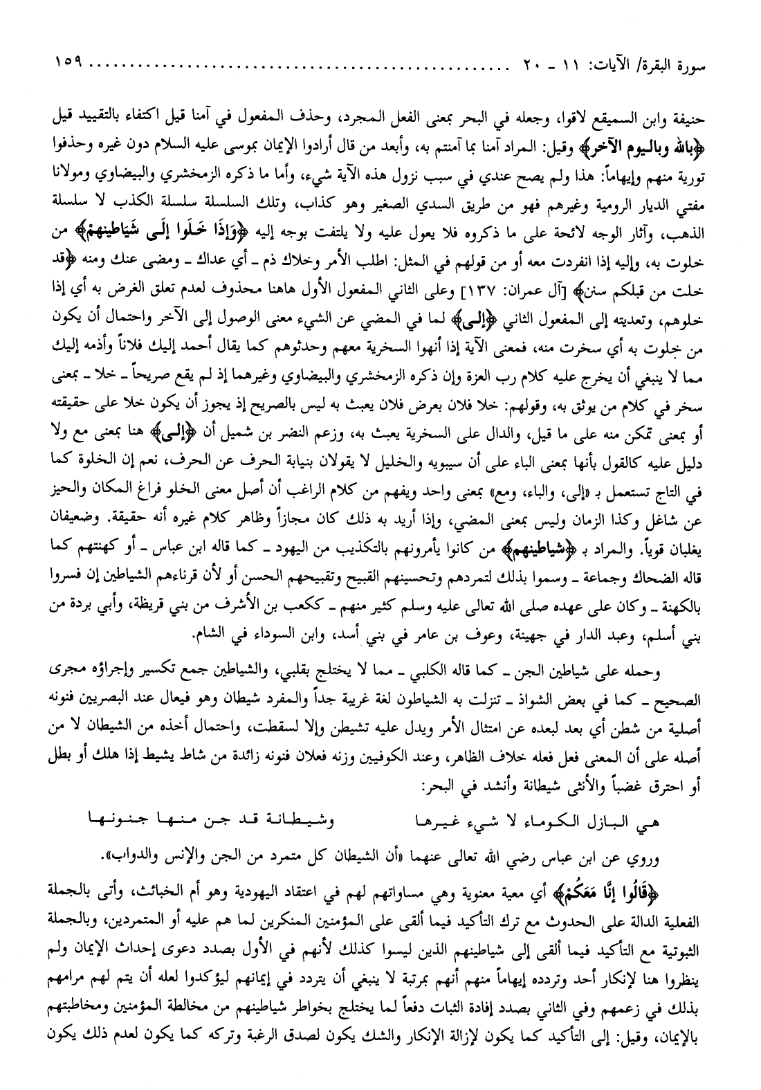 حنيفة وابن السميقع لاقوا، وجعله في البحر بمعنى الفعل المجرد، وحذف المفعول في آمنا قيل اكتفاء بالتقييد قيل بِاللَّهِ وَبِالْيَوْمِ الْآخِرِ وقيل: المراد آمنا بما آمنتم به، وأبعد من قال أرادوا الإيمان بموسى عليه السلام دون غيره وحذفوا تورية منهم وإيهاما: هذا ولم يصح عندي في سبب نزول هذه الآية شيء، وأما ما ذكره الزمخشري والبيضاوي ومولانا مفتي الديار الرومية وغيرهم فهو من طريق السدي الصغير وهو كذاب، وتلك السلسلة سلسلة الكذب لا سلسلة الذهب، وآثار الوجه لائحة على ما ذكروه فلا يعول عليه ولا يلتفت بوجه إليه وَإِذا خَلَوْا إِلى شَياطِينِهِمْ من خلوت به، وإليه إذا انفردت معه أو من قولهم في المثل: اطلب الأمر وخلاك ذم- أي عداك- ومضى عنك ومنه قَدْ خَلَتْ مِنْ قَبْلِكُمْ سُنَنٌ [آل عمران: 137] وعلى الثاني المفعول الأول هاهنا محذوف لعدم تعلق الغرض به أي إذا خلوهم، وتعديته إلى المفعول الثاني إِلى لما في المضي عن الشيء معنى الوصول إلى الآخر واحتمال أن يكون من خلوت به أي سخرت منه، فمعنى الآية إذا أنهوا السخرية معهم وحدثوهم كما يقال أحمد إليك فلانا وأذمه إليك مما لا ينبغي أن يخرج عليه كلام رب العزة وإن ذكره الزمخشري والبيضاوي وغيرهما إذ لم يقع صريحا- خلا- بمعنى سخر في كلام من يوثق به، وقولهم: خلا فلان بعرض فلان يعبث به ليس بالصريح إذ يجوز أن يكون خلا على حقيقته أو بمعنى تمكن منه على ما قيل، والدال على السخرية يعبث به، وزعم النضر بن شميل أن إِلى هنا بمعنى مع ولا دليل عليه كالقول بأنها بمعنى الباء على أن سيبويه والخليل لا يقولان بنيابة الحرف عن الحرف، نعم إن الخلوة كما في التاج تستعمل ب «إلى، والباء، ومع» بمعنى واحد ويفهم من كلام الراغب أن أصل معنى الخلو فراغ المكان والحيز عن شاغل وكذا الزمان وليس بمعنى المضي، وإذا أريد به ذلك كان مجازا وظاهر كلام غيره أنه حقيقة. وضعيفان يغلبان قويا. والمراد ب شَياطِينِهِمْ من كانوا يأمرونهم بالتكذيب من اليهود- كما قاله ابن عباس- أو كهنتهم كما قاله الضحاك وجماعة- وسموا بذلك لتمردهم وتحسينهم القبيح وتقبيحهم الحسن أو لأن قرناءهم الشياطين إن فسروا بالكهنة- وكان على عهده صلى الله تعالى عليه وسلم كثير منهم- ككعب بن الأشرف من بني قريظة، وأبي بردة من بني أسلم، وعبد الدار في جهينة، وعوف بن عامر في بني أسد، وابن السوداء في الشام.