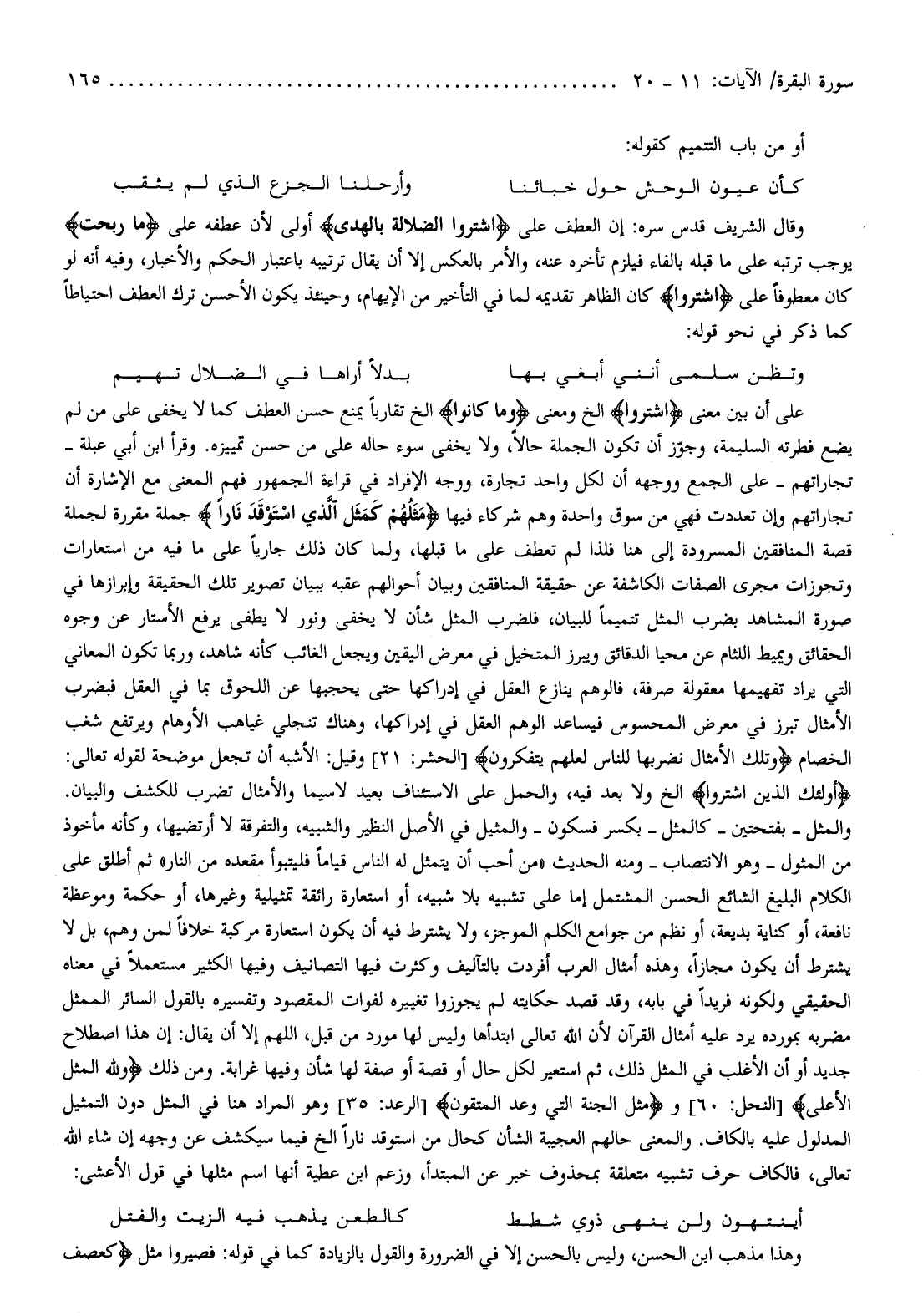 وقال الشريف قدس سره: إن العطف على اشْتَرَوُا الضَّلالَةَ بِالْهُدى أولى لأن عطفه على فَما رَبِحَتْ يوجب ترتبه على ما قبله بالفاء فيلزم تأخره عنه، والأمر بالعكس إلا أن يقال ترتيبه باعتبار الحكم والأخبار، وفيه أنه لو كان معطوفا على اشْتَرَوُا كان الظاهر تقديمه لما في التأخير من الإيهام، وحينئذ يكون الأحسن ترك العطف احتياطا كما ذكر في نحو قوله:
