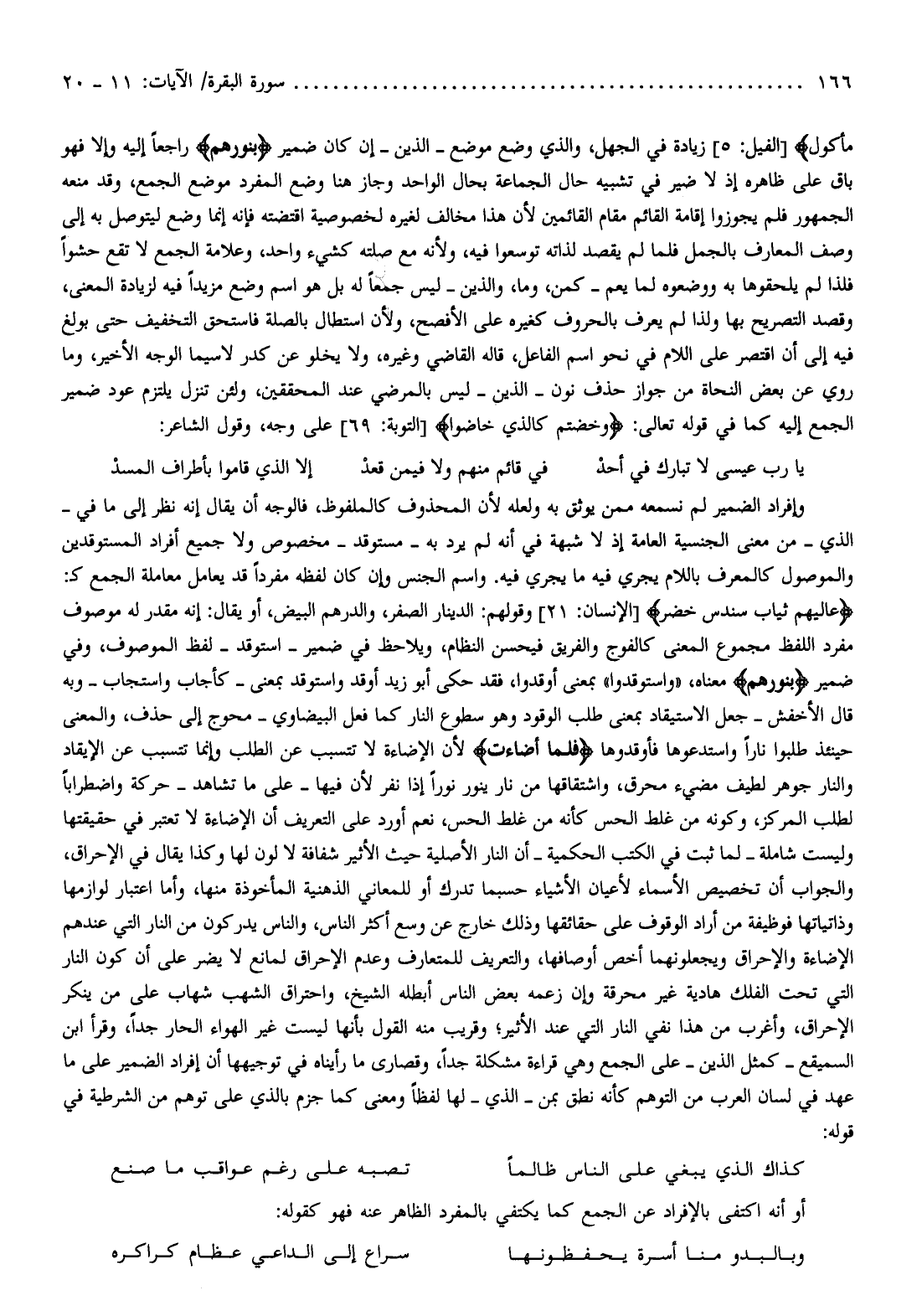 عالِيَهُمْ ثِيابُ سُندُسٍ خُضْرٌ [الإنسان: 21] وقولهم: الدينار الصفر، والدرهم البيض، أو يقال: إنه مقدر له موصوف مفرد اللفظ مجموع المعنى كالفوج والفريق فيحسن النظام، ويلاحظ في ضمير- استوقد- لفظ الموصوف، وفي ضمير بِنُورِهِمْ معناه، «واستوقدوا» بمعنى أوقدوا، فقد حكى أبو زيد أوقد واستوقد بمعنى- كأجاب واستجاب- وبه قال الأخفش- جعل الاستيقاد بمعنى طلب الوقود وهو سطوع النار كما فعل البيضاوي- محوج إلى حذف، والمعنى حينئذ طلبوا نارا واستدعوها فأوقدوها فَلَمَّا أَضاءَتْ لأن الإضاءة لا تتسبب عن الطلب وإنما تتسبب عن الإيقاد والنار جوهر لطيف مضيء محرق، واشتقاقها من نار ينور نورا إذا نفر لأن فيها- على ما تشاهد- حركة واضطرابا لطلب المركز، وكونه من غلط الحس كأنه من غلط الحس، نعم أورد على التعريف أن الإضاءة لا تعتبر في حقيقتها وليست شاملة- لما ثبت في الكتب الحكمية- أن النار الأصلية حيث الأثير شفافة لا لون لها وكذا يقال في الإحراق، والجواب أن تخصيص الأسماء لأعيان الأشياء حسبما تدرك أو للمعاني الذهنية المأخوذة منها، وأما اعتبار لوازمها وذاتياتها فوظيفة من أراد الوقوف على حقائقها وذلك خارج عن وسع أكثر الناس، والناس يدركون من النار التي عندهم الإضاءة والإحراق ويجعلونهما أخص أوصافها، والتعريف للمتعارف وعدم الإحراق لمانع لا يضر على أن كون النار التي تحت الفلك هادية غير محرقة وإن زعمه بعض الناس أبطله الشيخ، واحتراق الشهب شهاب على من ينكر الإحراق، وأغرب من هذا نفي النار التي عند الأثير وقريب منه القول بأنها ليست غير الهواء الحار جدا، وقرأ ابن السميقع- كمثل الذين- على الجمع وهي قراءة مشكلة جدا، وقصارى ما رأيناه في توجيهها أن إفراد الضمير على ما عهد في لسان العرب من التوهم كأنه نطق بمن- الذي- لها لفظا ومعنى كما جزم بالذي على توهم من الشرطية في قوله: