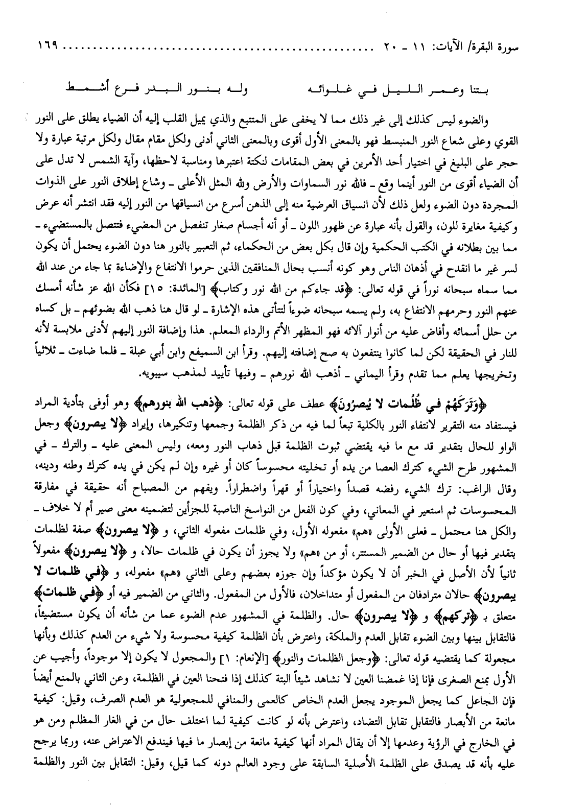 وَتَرَكَهُمْ فِي ظُلُماتٍ لا يُبْصِرُونَ عطف على قوله تعالى: ذَهَبَ اللَّهُ بِنُورِهِمْ وهو أوفى بتأدية المراد فيستفاد منه التقرير لانتفاء النور بالكلية تبعا لما فيه من ذكر الظلمة وجمعها وتنكيرها، وإيراد لا يُبْصِرُونَ وجعل الواو للحال بتقدير قد مع ما فيه يقتضي ثبوت الظلمة قبل ذهاب النور ومعه، وليس المعنى عليه- والترك- في المشهور طرح الشيء كترك العصا من يده أو تخليته محسوسا كان أو غيره وإن لم يكن في يده كترك وطنه ودينه، وقال الراغب: ترك الشيء رفضه قصدا واختيارا أو قهرا واضطرارا. ويفهم من المصباح أنه حقيقة في مفارقة المحسوسات ثم استعير في المعاني، وفي كون الفعل من النواسخ الناصبة للجزأين لتضمينه معنى صير أم لا خلاف- والكل هنا محتمل- فعلى الأولى «هم» مفعوله الأول، وفي ظلمات مفعوله الثاني، ولا يُبْصِرُونَ صفة لظلمات بتقدير فيها أو حال من الضمير المستتر، أو من «هم» ولا يجوز أن يكون في ظلمات حالا، ولا يُبْصِرُونَ مفعولا ثانيا لأن الأصل في الخبر أن لا يكون مؤكدا وإن جوزه بعضهم وعلى الثاني «هم» مفعوله، وفِي ظُلُماتٍ لا يُبْصِرُونَ حالان مترادفان من المفعول أو متداخلان، فالأول من المفعول. والثاني من الضمير فيه أو فِي ظُلُماتٍ متعلق ب تَرَكَهُمْ ولا يُبْصِرُونَ حال. والظلمة في المشهور عدم الضوء عما من شأنه أن يكون مستضيئا، فالتقابل بينها وبين الضوء تقابل العدم والملكة، واعترض بأن الظلمة كيفية محسوسة ولا شيء من العدم كذلك وبأنها مجعولة كما يقتضيه قوله تعالى: وَجَعَلَ الظُّلُماتِ وَالنُّورَ [الإنعام: 1] والمجعول لا يكون إلا موجودا، وأجيب عن الأول بمنع الصغرى فإنا إذا غمضنا العين لا نشاهد شيئا البتة كذلك إذا فتحنا العين في الظلمة، وعن الثاني بالمنع أيضا فإنّ الجاعل كما يجعل الموجود يجعل العدم الخاص كالعمى والمنافي للمجعولية هو العدم الصرف، وقيل: كيفية مانعة من الأبصار فالتقابل تقابل التضاد، واعترض بأنه لو كانت كيفية لما اختلف حال من في الغار المظلم ومن هو في الخارج في الرؤية وعدمها إلا أن يقال المراد أنها كيفية مانعة من إبصار ما فيها فيندفع الاعتراض عنه، وربما يرجح عليه بأنه قد يصدق على الظلمة الأصلية السابقة على وجود العالم دونه كما قيل، وقيل: التقابل بين النور والظلمة